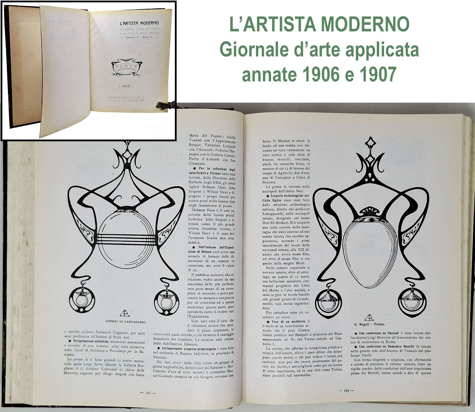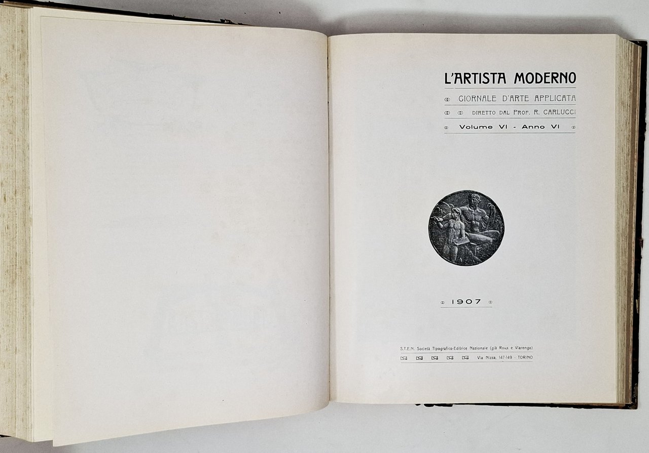 In un unico tomo, di dimensioni 19,5 x 25 cm circa, sono state rilegate due intere annate (1906 e 1907) della celebre rivista pubblicata a Torino tra il 1901 e il 1935 'L'artista Moderno / giornale d'arte applicata'. Queste due annate rappresentano un vero e priprio trionfo dell'art Nouveau che, in quegli anni, influenzava la grafica, l'architettura e le arti applicate a livello internazionale. Focus di questa testata è l'intero spettro delle arti applicate: le tecniche incisorie (ampio spazio è dato anche agli ex libris, ai frontespizi, alle illustrazioni e alle testatine di pubblicazioni varie), l'arredamento, l'architettura, il ricamo, l'oreficeria, la scultura,. Tra gli artisti presenti in queste due annate citiamo: E. Mattehy, R. Carlucci, G. Regoli, S. Pirani, G. Mataloni, F. Balbis, F. Giannetti, A. Covini, Luigi Dal Monte, E. Filippelli, F. Lo Vasco, O. Andreini, L. Chiapperini, O. Rieth, G. Mataloni, M. Frisch, L. Risso, G. Palanti, A. De Riquez, F. Melis-Marini, Carlo Gagel, E. Cotti, L. Carroli, G. Marengo, A. beltrame, H. Christiansen, Arturo Taddio, U. Manini, A. Luthi, Arch. E. Basile, G. W. Dysselhof, G. Fiorentino,V. Bonanni, E. Zalaffi, L. Mina, U. della Latta, A. Santi, Curt Seidel, . Ampio spazio è dedicato all'Esposizione di Milano e alla VII biennale di Venezia. Pagine: 388 (annata 1906); 336 + CLII (annata 1907). Stato di conservazione: usure sulla rilegatura che presenta abrasioni e qualche mancanza del rivestimento (marmorizzato) sui piatti ma interno decisamente ben conservato. Nessuna firma d'appartenenza, timbro, annotazione, sottolineatura o altri segni nel testo. Rilegatura con copertina cartonata rigida con piatti marmorizzati. Titolo in oro sul dorso.Non sono conservate all'interno della rilegatura le copertine dei singoli numeri.