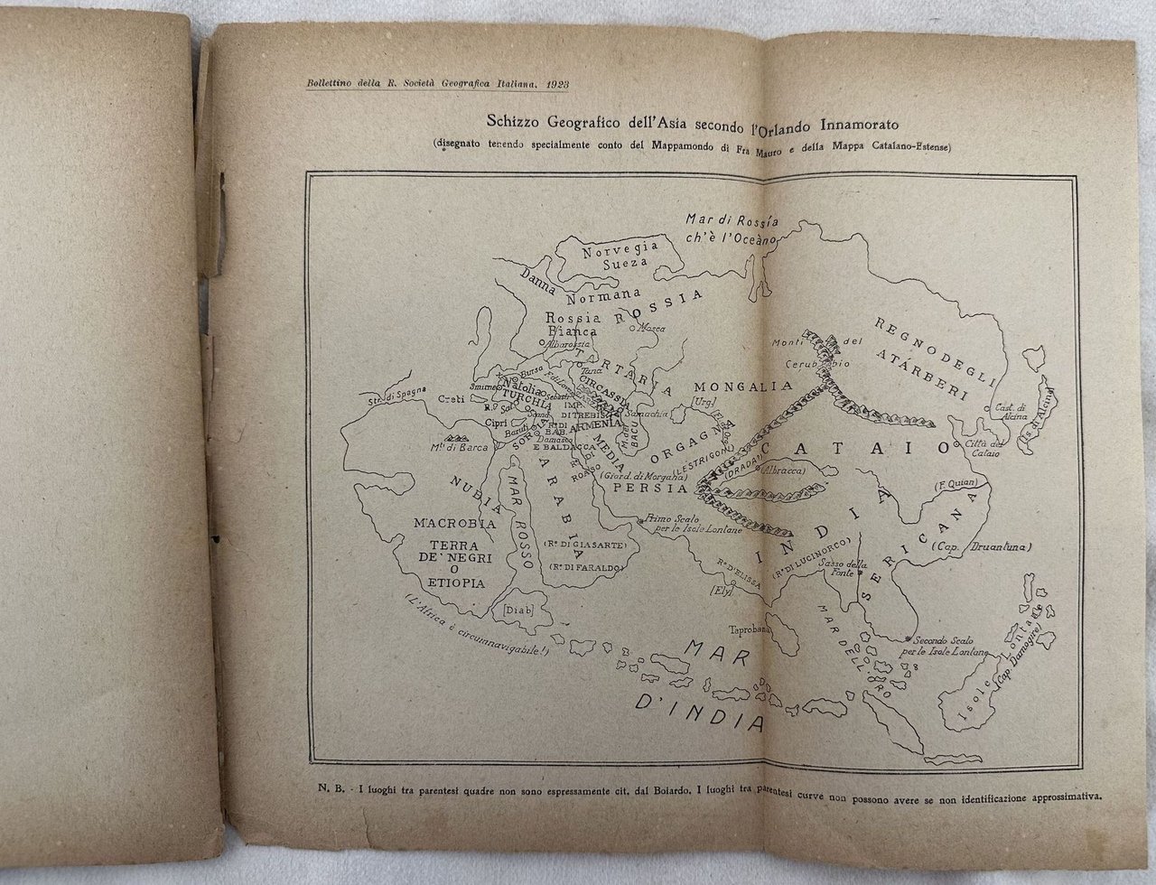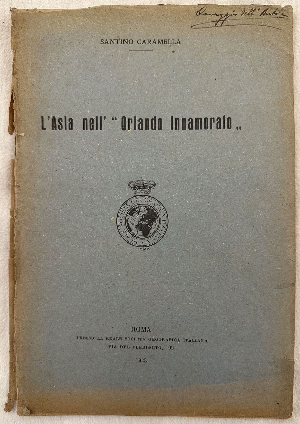 Interessante pubblicazione del 1923, uno studio sull'Asia nell'"Orlando Innamorato" scritto da Santino Caramella. Alla fine è presente una mappa: Schizzo Geografico dell'Asia secondo l'Orlando innamorato. Dedica dell'autore in copertina senza firma. In discrete condizioni Copertina editoriale in mediocri condizioni generali con usure ai margini e dorso. Piatto posteriore mancante. Legatura in buone condizioni. Mappa finale staccata. All'interno le pagine si presentano in buone condizioni con rare fioriture. In 8. cm 23,5x15,5. Pp. 42+(1).Interesting pamphlet of 1923, a study about Asia in "Orlando Innamorato" written by Santino Caramella. At the end there is a map: Schizzo Geografico dell'Asia secondo l'Orlando innamorato. Dedication of the author in the cover without signature. In fair conditions. Editorial cover in poor general conditions lightly worn in the extremities. Back plate lacks. Binding in good conditions. Inside pages are in good conditions with occasional foxing. Final map lacks. In 8. cm 23,5x15,5. Pp. 42+(1).