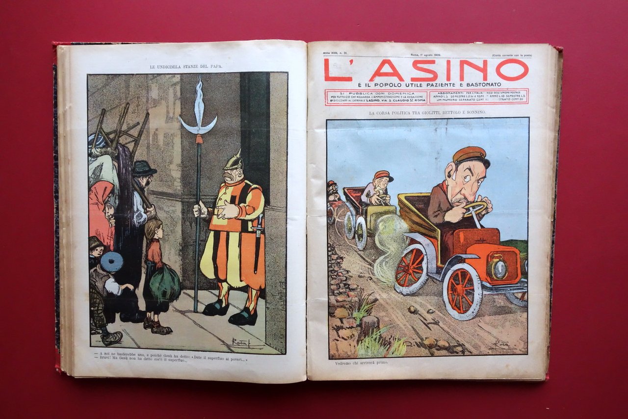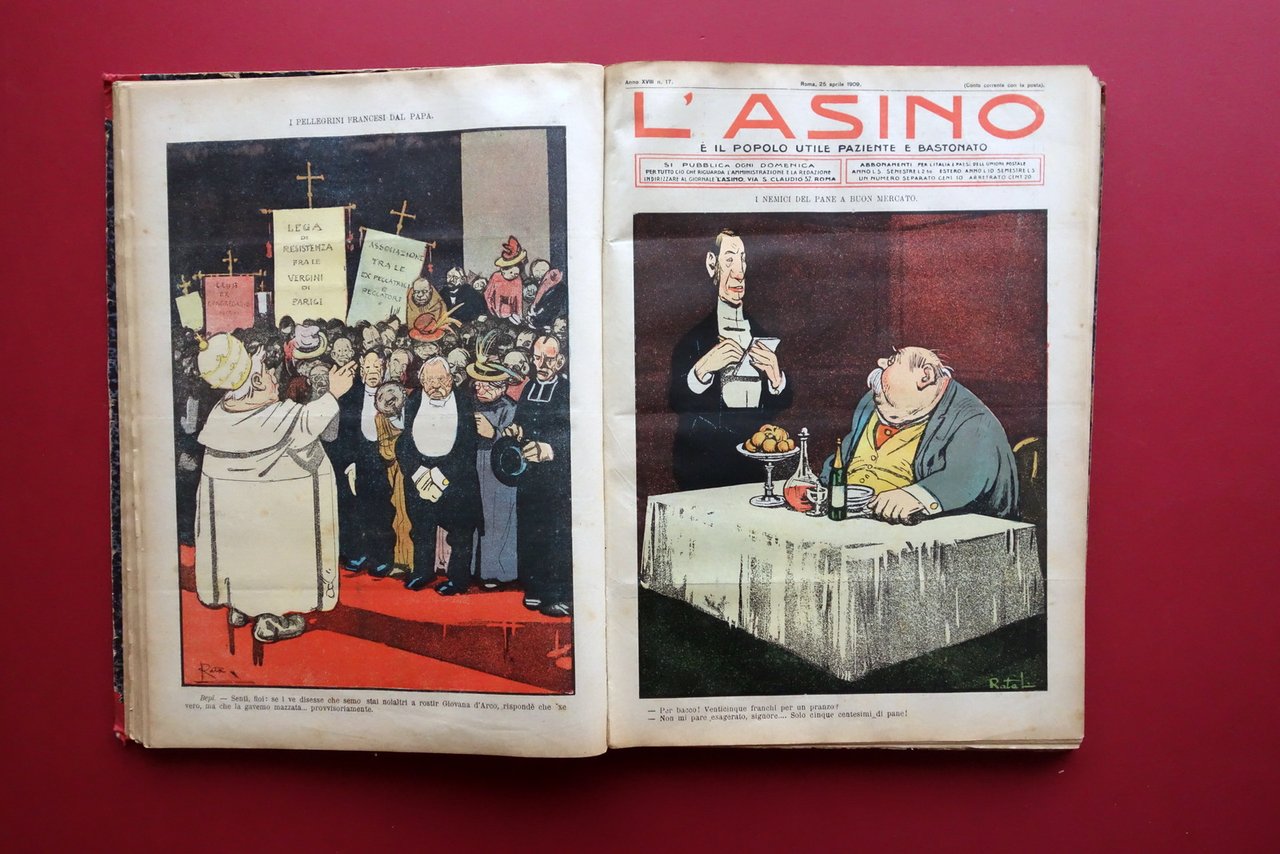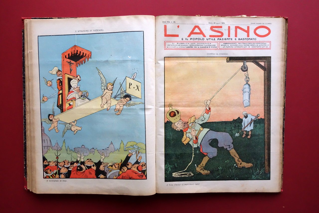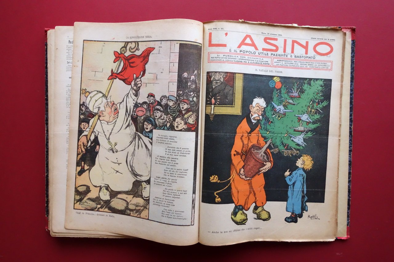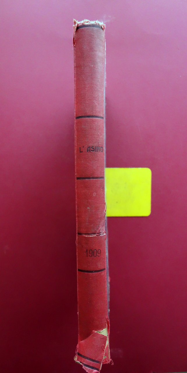 Giornale settimanale (52 numeri), † L'Asino Ë il popolo utile, paziente e bastonato" anno XVIII - 52 numeri anno completo - 1909 Stabilim. Tipografico Italiano, Roma 1909; cm 38,5x28,5; pp. circa 8 per ciascun numero (esemplari autonomi con numerazione progressiva), con varie ill. in b/n nel t.; prima e ultima pagina di ogni numero con bella grande illustrazione satirica a colori di Ratalanga. Legatura d'epoca in mezza tela (dorso e angoli) con titolo impresso al dorso, piatti marmorizzati. 52 numeri completi, corrispondenti all'intera annata del 1909, rilegati in volume. Condizioni di conservazione Condizioni nel complesso buone con tracce d'uso e leggeri segni del tempo; piatti con alcune leggere abrasioni e graffietti, agli angoli piccoli strappetti alla tela. Dorso con taglietto di qualche cm alla parte centrale, cuffie sgualcite di cui quella inferiore con parziale distacco del rivestimento telato. Interni buoni con minimo foxing e leggerissimi per lo pi˘ marginali principi di ingiallimento della carta; poche pagine con piccoli marginali strappetti restaurati mediante nastro per riparazioni cartacee (vedi foto). Numero 1 con restauro cartaceo di strappetto alle pp. 1-2 e 6-7 (vedi foto). Numero 52 sgualcito ai margini. Carta di guardia anteriore con marginali mancanze. † Interessante rivista dalla forte impronta socialista, dal taglio ferocemente anticlericale e antimilitarista. Attraverso l'utilizzo della critica satirica viene dato ampio spazio, in particolare nei primi numeri, al devastante terremoto di Messina e Reggio Calabria avvenuto alla fine di dicembre del 1908. Bellissime le illustrazioni a colori di Ratalanga. Anno XVIII completo, rilegato in volume. † SETT227.L27313 N "
