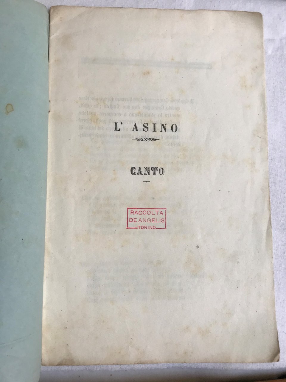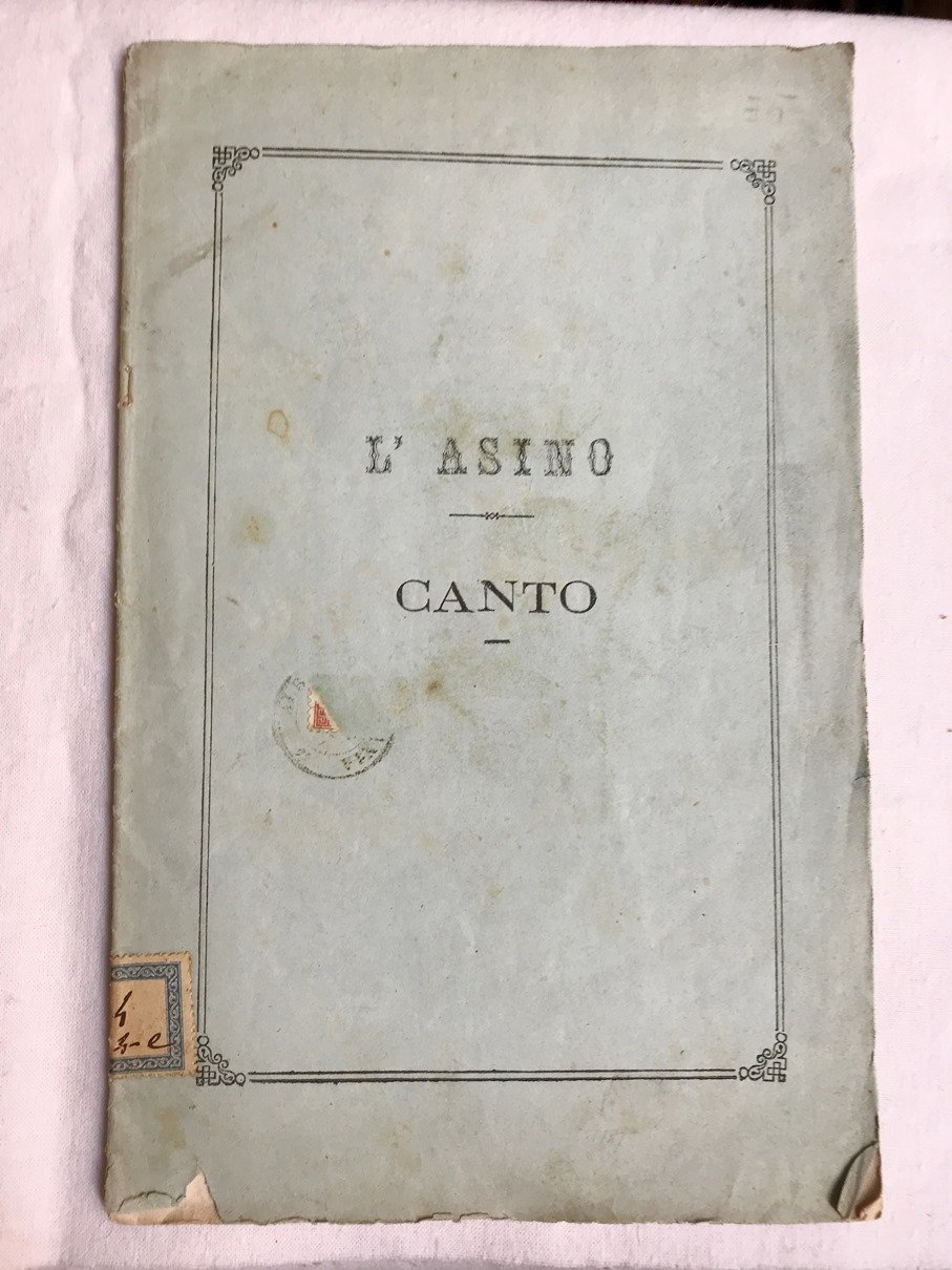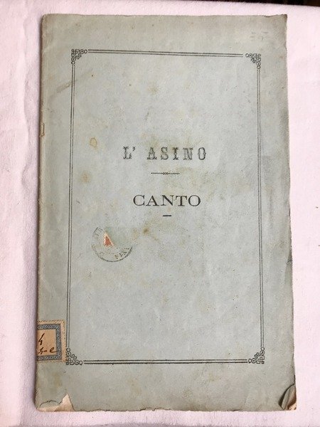 Fascicolo in 8, brossura editoriale, titolo al piatto anteriore entro bordura silografica, dati editoriali al piatto posteriore, occhiello (ex Raccolta de Angelis), prologo, 16 pp. Il Conte di Campomaggiore Saverio Rendina, nasce nel 1798, benvoluto da Ferdinando II, confinato invece agli arresti durante lassoluto dominio borbonico, nel 1861, appena compiuto il Regno dItalia, il conte di Campomaggiore viene nominato dal Re, Senatore del regno e contemporaneamente eletto deputato a grande maggioranza dal collegio elettorale di Potenza, egli rinunci al primo degli alti due incarichi per ritenere il mandato confidatogli dai suoi concittadini. Uomo di Stato e di Lettere, il Conte Rendina gi autore di una Tragedia ed alcuni Poemetti: La Lucania, Il Vecchio del Lago, Lisa ed Arnaldo, quando compone il presente Canto dellAsino, divertente e dissacrante poemetto. Sicuramente pubblicato in pochissime copie un assoluta rarit bibliografica. Originale. In bello stato.