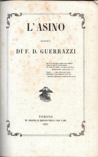In 8° grande, pp. 6 nn., 627; m/pelle verde coeva con tit. e fregi in oro al ds.; ritratto dell'A. in litografia di Giordana e Salussolia all'antip, testo in elegante cornice formata do doppio filetto e fregi agli angoli, finalini. In questa opera politica, come ne "Il buco nel muro" (1862), si manifesta la vena satirica dello scrittore e rivoluzionario livornese antifrancese e antipiemontese, e fu proibita dalla Direzione suprema di Polizia di Vienna il 3 dicembre 1857. Parenti, p. 287. Lievi arrossamenti per il tipo di carta soprattutto alle prime ed ultime pp. 122/27