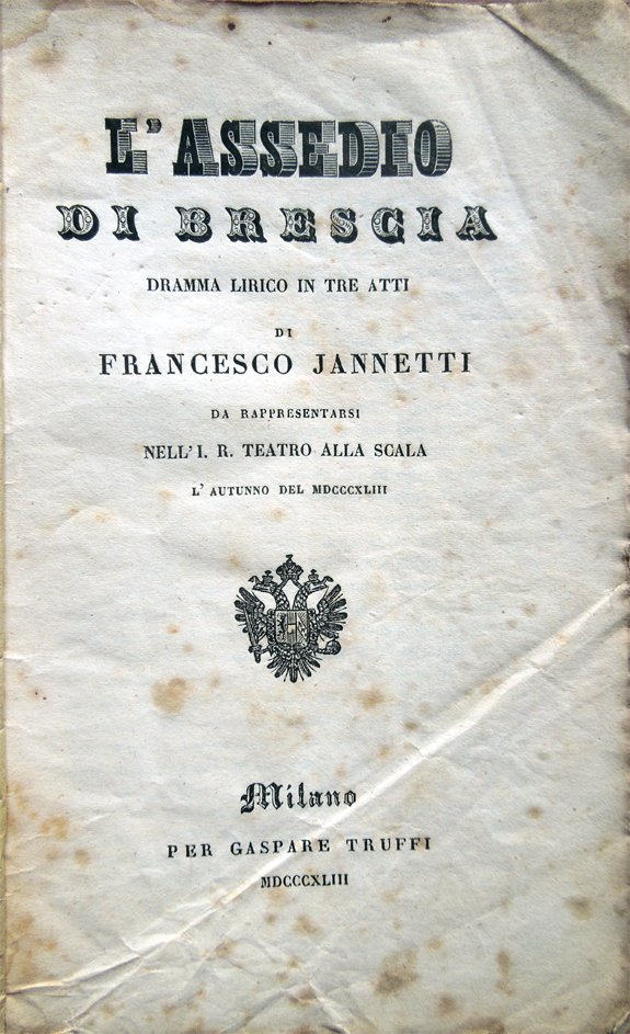 L'assedio di Brescia. Dramma lirico in tre atti di Francesco Jannetti da rappresentarsi nell'I. R. Teatro alla Scala l'autunno del 1843