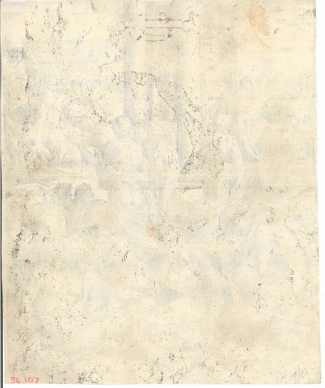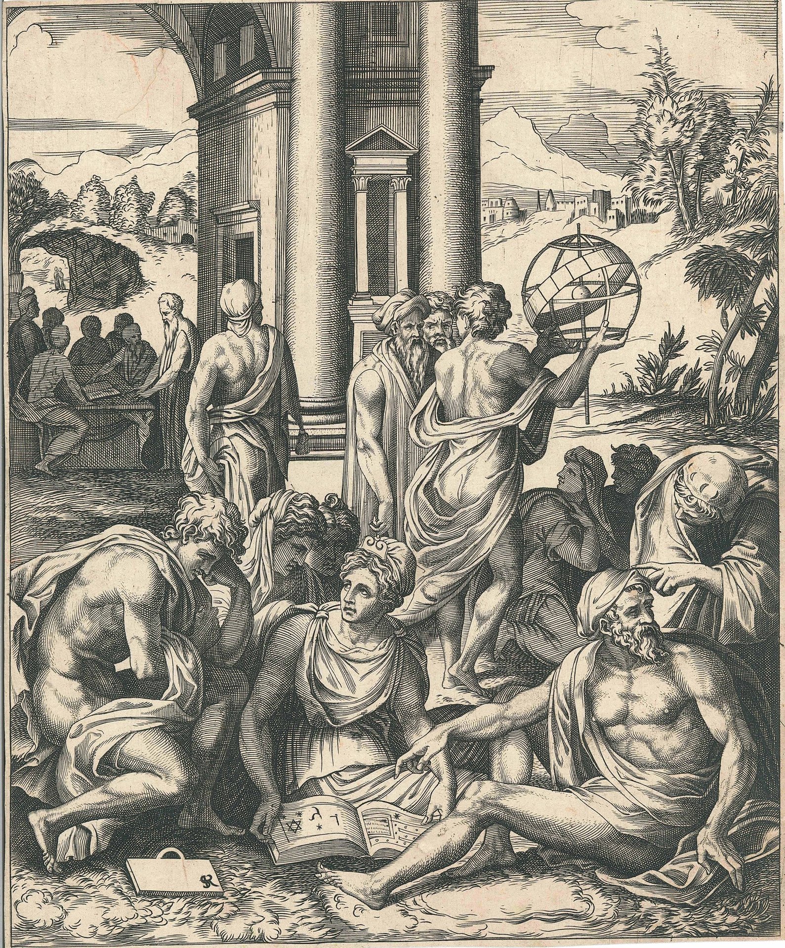 >bulino, mm 238x194, è impressa su carta filigrana P gotico con fiore databile alla prima metà del Cinquecento, 2 mm di margine oltre la linea di riquadro. Monogramma "SR" su una tavola bianca in basso a sinistra. Secondo il Vasari significava "il segno di Raffaello", e fu adottato dal Dente come proprio. Il soggetto è da mettersi in relazione con i disegni eseguiti da Raffaello sul tema della Sacra Famiglia, dove Dente se ne rivela vivace e dinamico interprete, di contro a un irrigidito Marcantonio, anch'egli esecutore del soggetto. E' noto uno stato, non conosciuto né dal Bartsch né dal Kristeller, recante anche la sigla "RVP", che sarebbe naturalmente da sciogliersi in "Raphael Urbinatis pinxit". Bella tiratura ben conservata, di questa articolata composizione che raffigura, immersi in un arioso paesaggio, tre gruppi di personaggi: un gruppo di filosofi si riunisce sotto un portico �in disputa� intorno ad un libro;altri tre discutono intorno ad una sfera armillare, mentre nel primo piano, una giovane donna invita un giovane �malinconico� a consultare un libro di astrologia. La composizione fu copiata con varianti in una silografia nell'edizione del 1540 de Le Sorti dei Francesco Marcolini.