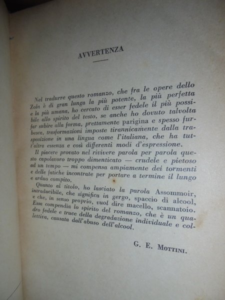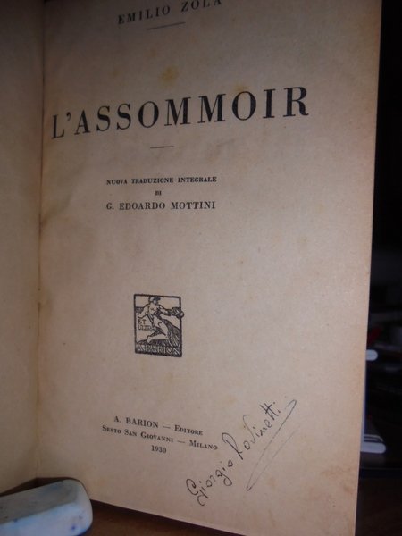 Emilio, Zola. Milano, A. Barion, 1930. L' Assomoir. Nuova traduzione integrale di G. Edoardo Mottini. In-16°, m. tela. 463 pp. Carta leggermente ingiallita in prossimità dei tagli ma ben conservato con firma di ex proprietà nel frontespizio. Neg. magazz. mob. grigio.