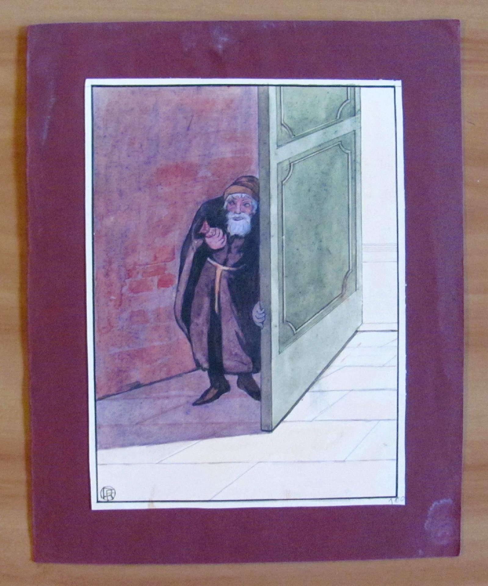 Tavola Originale L'astuzia di un accattone cieco, pagina 151 forse per Gil Blas di Santillana (?), Firmata RF (?). Tavola originale in tempera in cartoncino rigido 18x25 montata su cartoncino bordeaux 25x31,5, non datata ma primi '900. Rara e in Ottimo stato. , Molto buono (Very Good)
