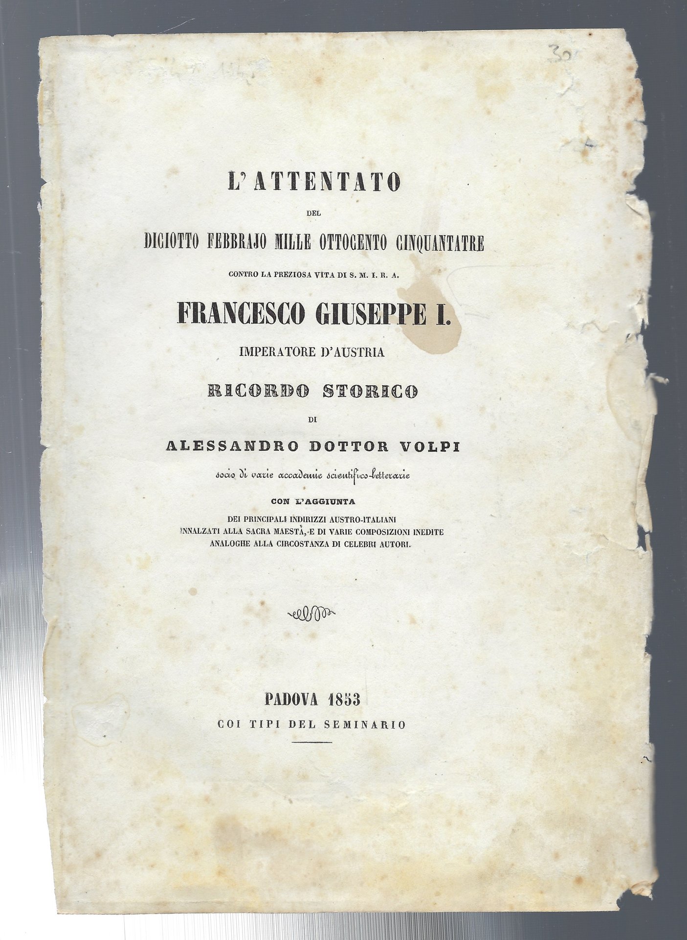 L'attentato del diciotto febbrajo mille ottocento cinquantatre contro la preziosa vita di S.M.I.R.A. Francesco Giuseppe I. Imperatore d'Austria. Ricordo storico di Alessandro Dottor Volpi socio di varie accademie scientifico-letterarie.