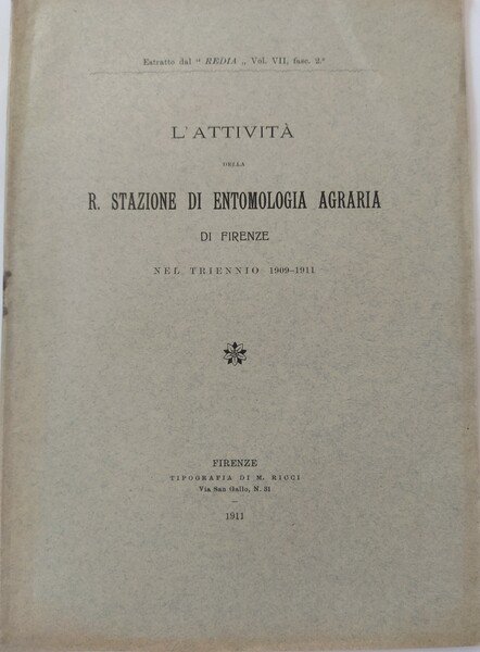 L'attività della R. Stazione di Entomologia Agraria di Firenze nel triennio 1909 – 1911