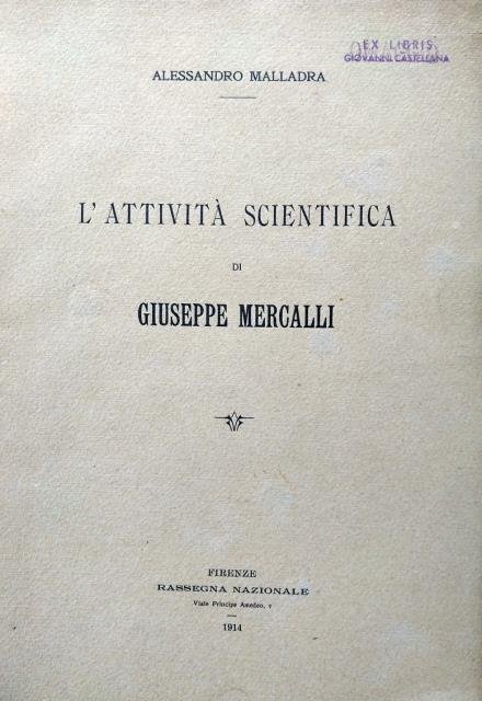 Rassegna Nazionale, Firenze, 1914. In 8vo grande, in antip. ill. fot. del Mercalli, pp. 31 (con l'Elenco cronologico delle pubblicazioni del Prof. Giuseppe Mercalli), bross. edit. Giuseppe Mercalli, naturalista e vulcanologo italiano (Milano, 1850 – Napoli, 1914). Docente di vulcanologia e sismologia all'Università di Napoli, successe nel 1911 a R. V. Matteucci nella direzione dell'Osservatorio Vesuviano. Esercitò una vasta attività scientifica nelle varie branche delle scienze naturali, ma si dedicò soprattutto a studi di vulcanologia e sismologia. A lui si devono relazioni su terremoti avvenuti in Italia e all'estero e numerosi studi sui fenomeni vulcanici dello Stromboli, di Vulcano e del Vesuvio, la prima carta sismica d'Italia e una scala sismica (scala Mercalli), tuttora usata, anche se con varie modifiche. Tra le sue opere: "Vulcani e fenomeni vulcanici in Italia" (1883), "I vulcani attivi della Terra" (1907). Alessandro Malladra, vulcanologo italiano (Torino, 1865 – Roma, 1944). Tra i successori di Mercalli, fu professore di scienze naturali nel collegio Mellerio - Rosmini di Domodossola, e dal 1910 lavorò nell'Osservatorio vesuviano di cui fu a lungo direttore (dal 1927 al 1935). Autore di importanti scritti geologici e soprattutto vulcanologici, diresse gli"Annali dell'Osservatorio vesuviano" e il "Bulletin vulcanologique". Malladra ha rappresentato una delle figure più importanti della vulcanologia italiana. A lui, infatti, si devono le continue osservazioni dei fenomeni vulcanici del Vesuvio a partire dal 1909. Come riferisce Ungaretti, Malladra "nulla dice di se stesso, delle sue discese nel cratere, attaccato in fondo a trecento metri d’una fune". Poco prima della fine del mandato di direttore donò all’Osservatorio Vesuviano 50 medaglie di lava che costituiscono una buona parte della collezione dell’osservatorio. Il chimico Guido Carobbi nel 1933 rinvenne nelle fumarole del Vesuvio un nuovo minerale che chiamò malladrite in onore del vulcanologo torinese. Ex Libris Giovanni Castellana. Molto buono lo stato di conservazione.