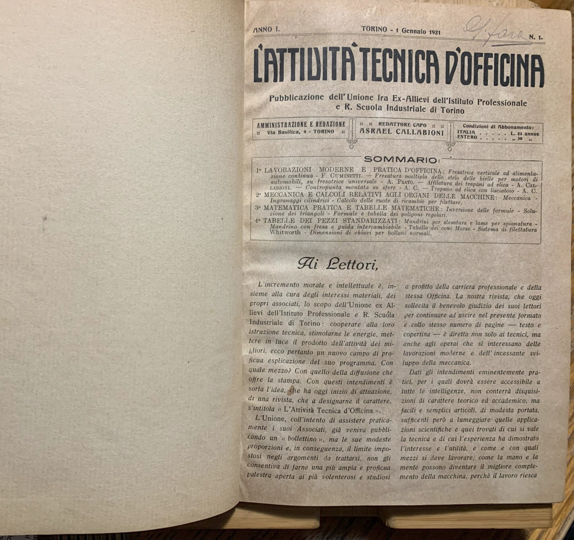 I ed. della pubblicazione mensile dell'Unione fra Ex-Allievi dell'Istituto Professionale e R. Scuola Industriale di Torino (Anno I., NN. 1-12, 1 Gennaio-1 Dicembre 1921). Amministrazione e redazione: Via Basilica, 9 - Torino. I 12 numeri della rivista sono rilegati in un unico volume. VIII/ 384/ rilegatura in tela cerata verde scuro con titoli dorati al dorso. Con illustrazioni in nero (disegni e grafici) e in b/n (fotografie). Stato buono (lieve usura della copertina - pagine brunite). Sommario argomenti: Lavorazioni moderne e pratica d'officcina - Meccanica e calcoli relativi agli organi delle macchine - Matematica pratica e tabelle matematiche - Tabelle dei pezzi standardizzati.