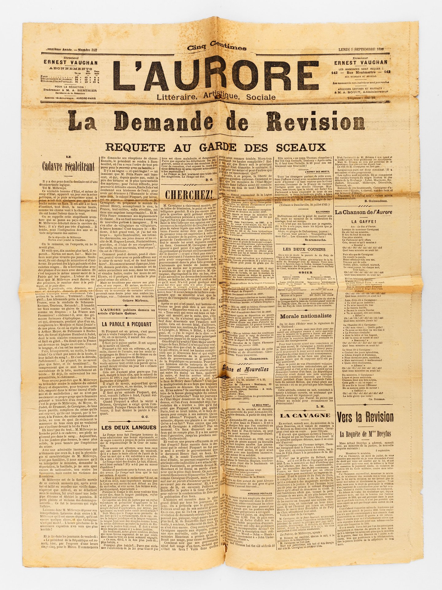 L'Aurore littéraire, artistique, sociale. Numéro 322 - Lundi 5 septembre 1898 : La Demande de Révision. Requête au Garde des Sceaux [ Affaire Dreyfus ]