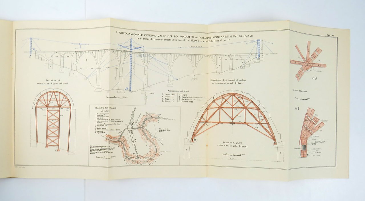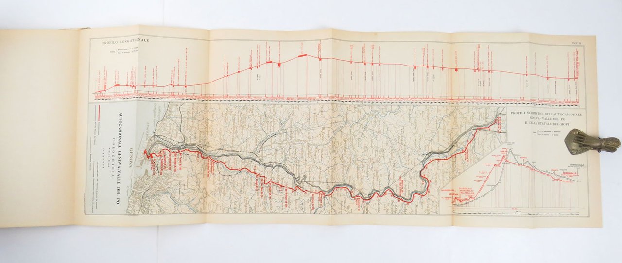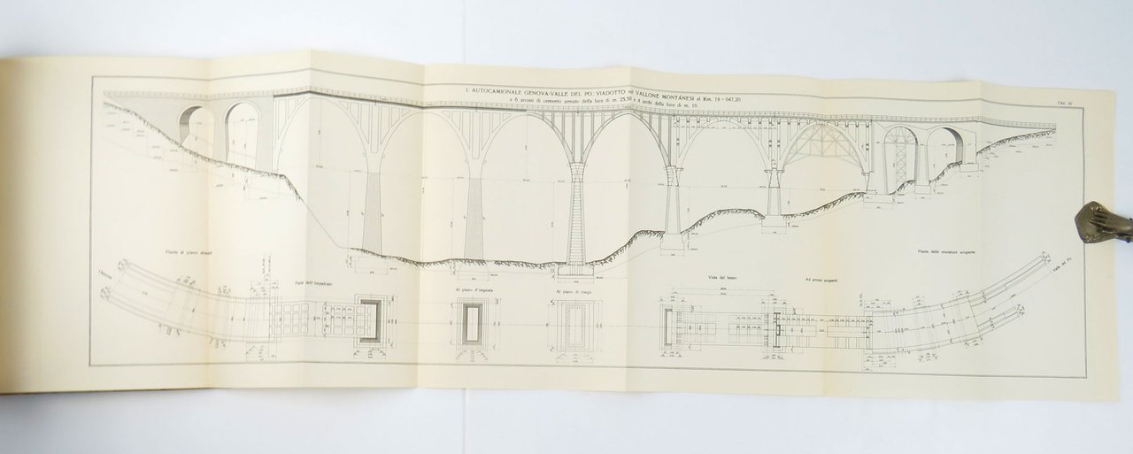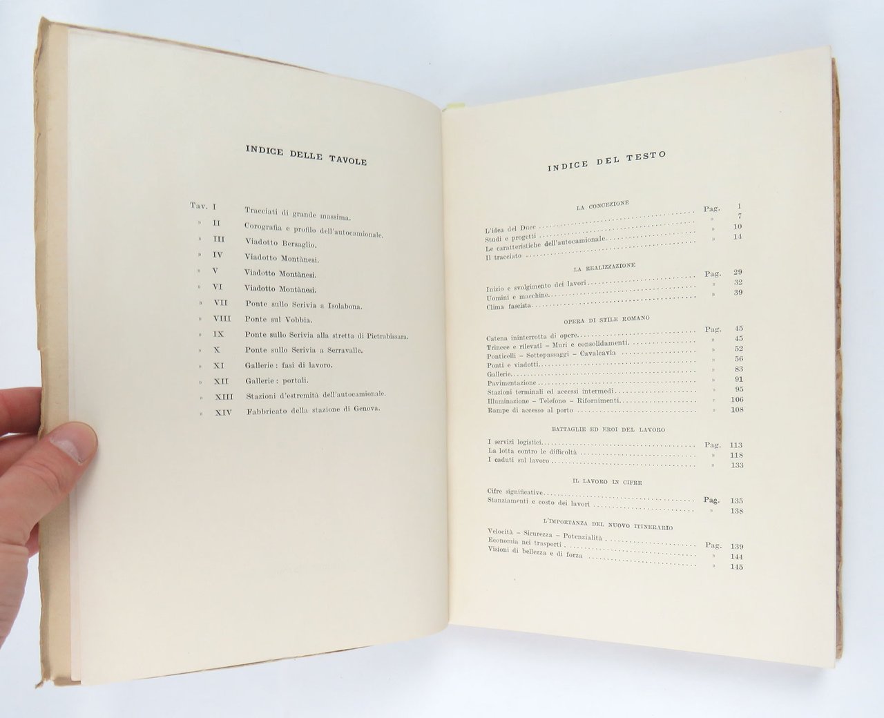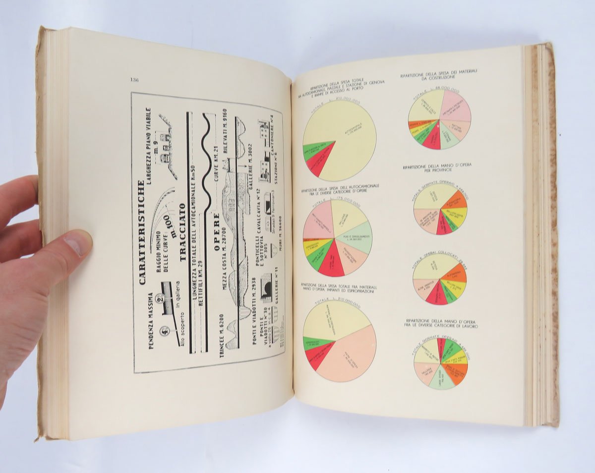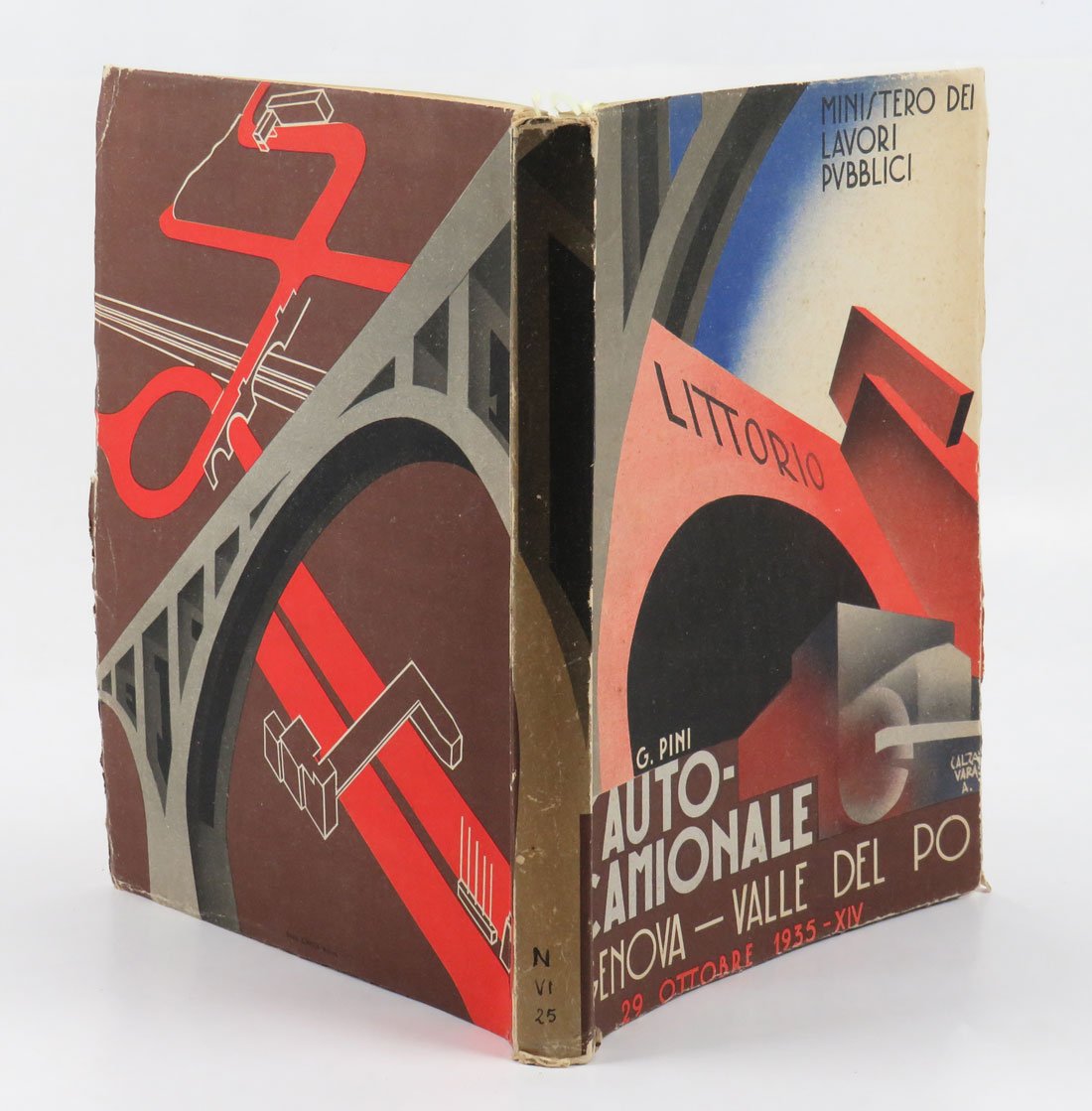 LIBROEdizione originale.Ottimo esemplare (minimi segni del tempo perimetrali alla copertina e antica annotazione in inchiostro al piede del dorso, che non disturbano il bellissimo disegno di Calzavara).Splendido volume celebrativo della grande opera realizzata nel corso della prima metà degli anni trenta e inaugurata dal Re il 29 ottobre 1935: l’«autocamionale» collegava Genova a Serravalle Scrivia in Piemonte con un percorso acrobatico che si snodava lungo il tratto appenninico attraverso numerosi ponti e gallerie. Per l’epoca, si trattava di una realizzazione all’avanguardia, forse la prima autostrada “montana” della storia. Il percorso è stato in seguito sviluppato e inglobato nell’attuale «Autostrada dei Giovi» o A7. -- Il presente volume pubblica — con apparato iconografico aumentato e il decisivo contributo di design di Attilio Calzavara — il saggio che il progettista dell’opera, ingegnere Gaetano Pini, aveva approntato per gli «Annali dei lavori pubblici», la rivista ufficiale del ministero, fascicolo 10 dell’ottobre 1935. Il libro viene a volte datato «1936» poiché al frontespizio reca la data dell’«era fascista», dunque «29 ottobre XIV» che è precisamente l’anno che trascorre dal 28 ottobre ancora del 1935 al 28 ottobre finalmente del 1936.Bibl. Attilio Calzavara: Works and Commissions of an Anti-Fascist Designer (Wolfsonian 1994), pp. 123-124; Kunst und Propaganda (cat. mostra Berlin 2007), p. 135