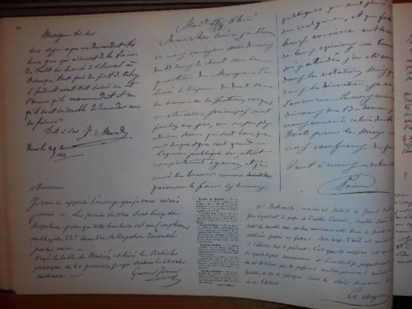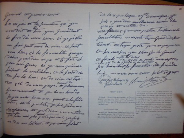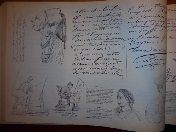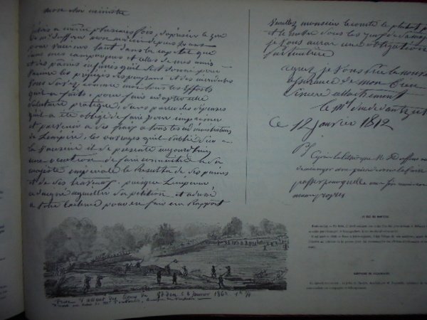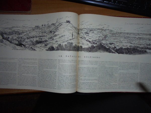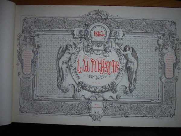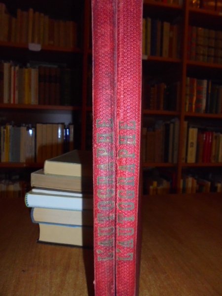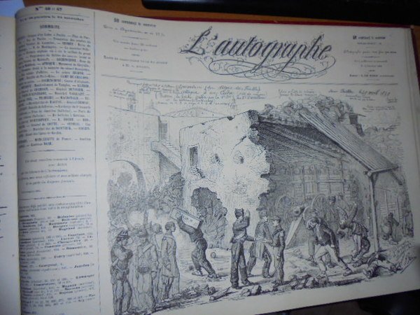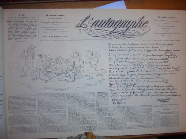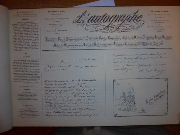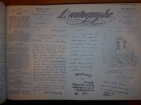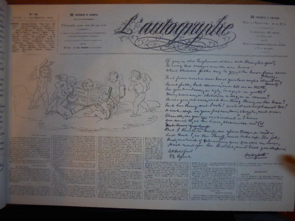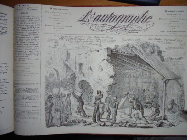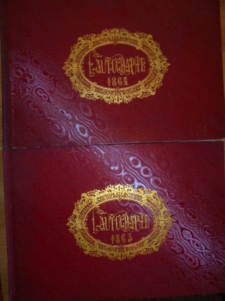 L’AUTOGRAPHE 1864 - 1865. Paris, Imprimerie Auguste Vallee, 17/11/1864-1865. Copie di testi e lettere con firme autografe. 2 volumi in-folio ad album (46,5 x 32,5), mezza tela con fregi in oro sui piani. iii, 208 pp. con bel frontespizio inciso; viii, da 209 a 408. Rivista bimestrale francese dedicata agli autografi e agli studi calligrafici: preceduto da un belliss. front. xilogr. a due colori, l’album è composto da tutti i numeri. Contenenti scritti di autori francesi e riproduzioni di autografi e manoscritti di personaggi storici di ogni paese, politici, musicisti, inventori, artisti, attori, sovrani, etc., con diverse figg. in legno n.t. e alcune caricature. In particolare l’ultimo fascicolo doppio della rivista è dedicato alla battaglia di Solferino, con belle incisioni dei luoghi principali del combattimento. Con indici onomastici al fine. Raro. No strappi. Bell' esemplare.
