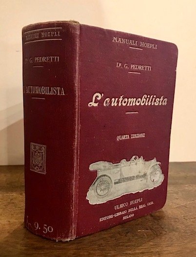 16mo (cm. 15), XXIX pp., 1 c.nn., 1064 pp. Con 1156 incisioni xilografiche intercalate nel testo. Legatura editoriale in piena tela illustrata. Tagli rossi. Quarta edizione (completamente rifatta ed ampliata, contenente le applicazioni dei motori senza valvole, delle turbine a scoppio e dei motori d’aviazione). Esemplare ben conservato. Provenienza: collezione Moretti, Roma. Manuali Hoepli.