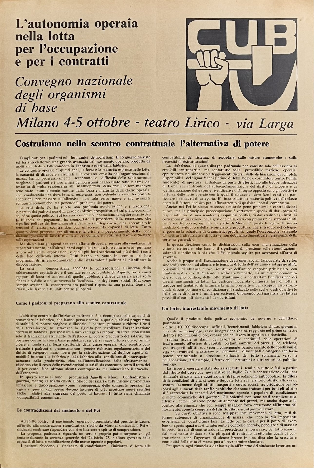 L'autonomia operaia nella lotta per l'occupazione e per i contratti. Convegno nazionale degli organismi di base. Milano 4-5 ottobre. Teatro Lirico Via Larga