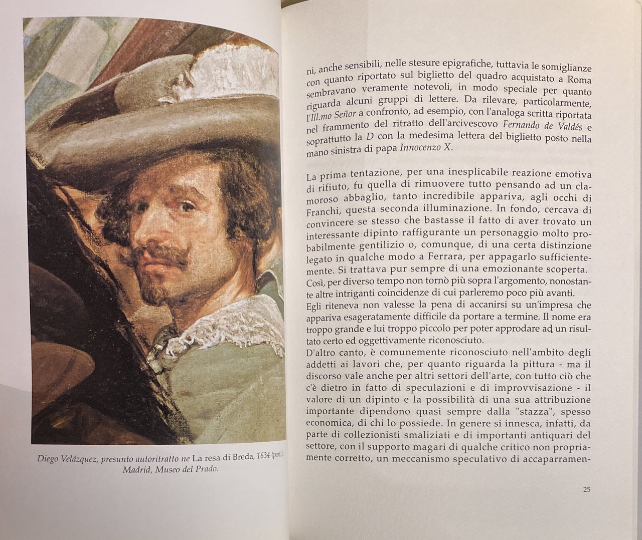 Si tratta di un racconto sulle vicende che hanno portato, nel 1982, alla scoperta di un importante autoritratto inedito del grade pittore spagnolo. Attraverso una serie incredibile di circostanze e coincidenze viene ricostruita la storia del dipinto realizzato a Ferrara nel 1629 e finito per vie misteriose nella bottega di un antiquario romano di di via Giulia. Numerosi riscontri documentali e fotografici con un'ampia serie di raffronti e ipotesi.
