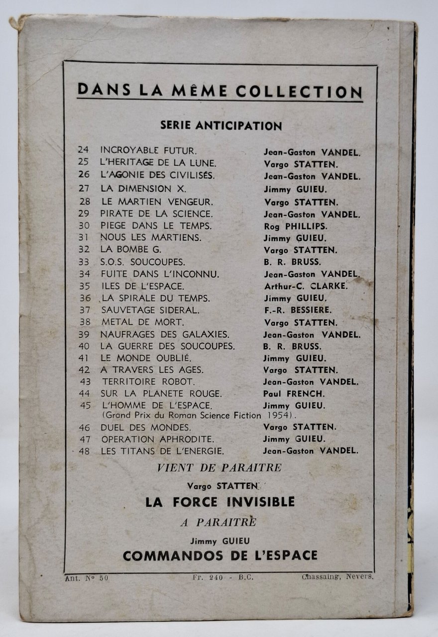 Collection 'Anticipation', numero 50. Adapté de l'anglais par Igor B. Maslowski. Lingua del testo: francese. Formato: 13 x 19 cm circa. Pagine: 184 + [6]. Stato di conservazione: superficiali abrasioni e leggere pieghette sui margini della coperta (in particolare sui margini del dorso), un'ampia mancanza sul margine inferiore (parte bianca) del foglio che contiene le due pagine 15 e 16 (il difetto non riguarda il testo), lievi e appena accennate stropicciature di qualche pagina ma, nel complesso, un esemplare abbastanza buono. Interno privo di timbri, firme di appartenenza, annotazioni, sottolineature o altri segni nel testo. In brossura con copertina flessibile con illustrazione a colori di René Brantonne.