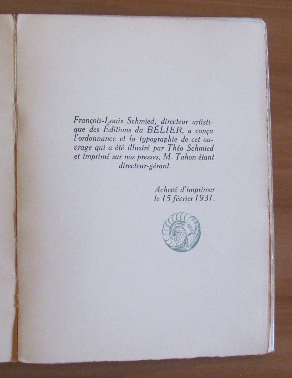 Vignette incise su legno, in tinta, a tutte le pagine di Théo Schmied. Editions de Belier - Paris, 1931. Tiratura Limitata a 850 esemplari numerati, nostro N.666. Brossura editoriale protetta da acetato. Firma del tempo al risguardo. Minima imperfezione alla cuffia superiore del dorso. 19,5x26; pp.167. Raro e in Ottimo stato. , Molto buono (Very Good)