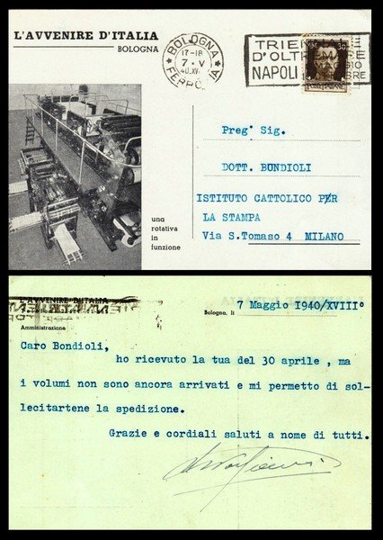 cartolina del quotidiano cattolico di Bologna "L'Avvenire d'Italia" con comunicazione datata 7 Maggio 1940 e firma dell'amministrazione; ottimo es.