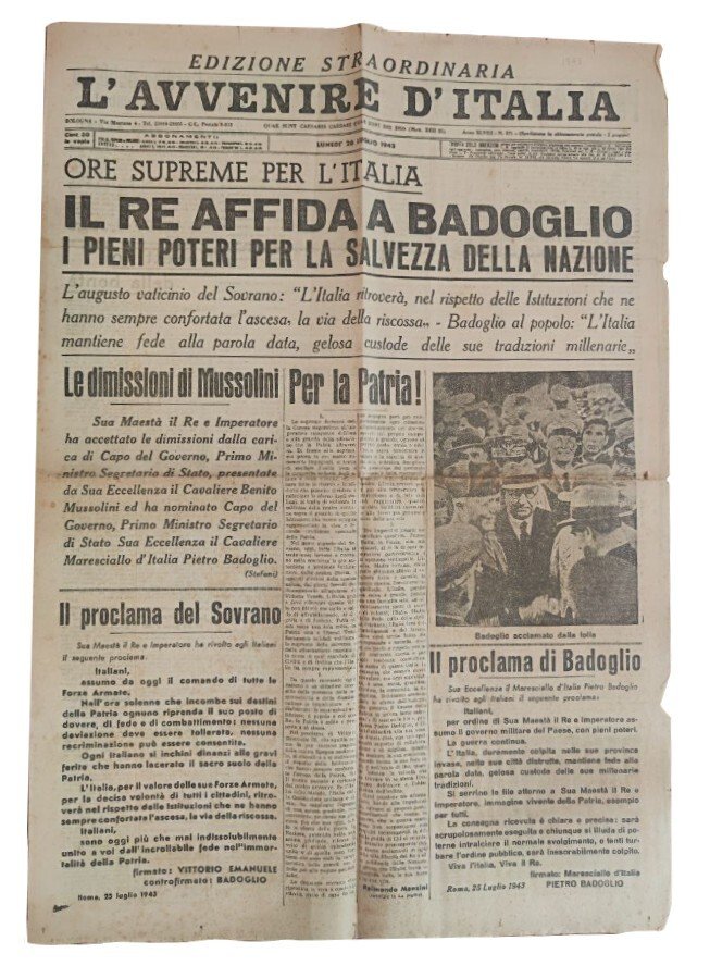 Mm. 578x420. Pp. 4. Edizione straordinaria 'Il Re affida a Badoglio i pieni poteri per la salvezza della nazione'. Fogli leggermente bruniti e fioriti. Prima edizione.