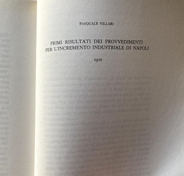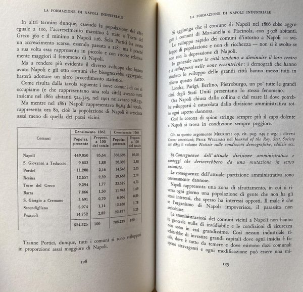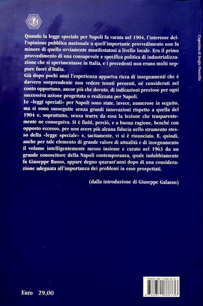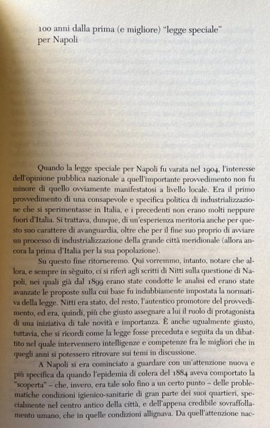 Soggetti: Napoli, Storia industriale, Industrializzazione, Legge speciale, 1904, Sviluppo, Mezzogiorno, Economia campana, Camera di commercio, Capitani d'Industria, Liberalismo, Borghesia, Francesco Saverio Nitti, Pasquale Villari, Barbagallo, Francesco Girardi, Davide Mele, Colajanni, Roberto Taeggi Piscicelli, Paolo Rispoli, Arlotta, Giuseppe Russo, Protopisani, Statistiche, Risorgimento economico, Storia locale napoletana, Età moderna, ottocento, Storia economica, Italia del Sud, Meridionalismo, Studi storici, Industrie, Produzione, Risanamento, Storiografia, Libri Vintage Fuori catalogo, Campania Felix, Scuola di Portici, Caserta, Salerno, Terra di Lavoro, Manlio Rossi Doria, Forza di lavoro, Operai, Fabbriche, Stato, Prima Guerra Mondiale, Giovanni Battista Mauro, Regno, Istituti di Emissione, Produzione bellica, Esportazione, Piccola-media impresa, Uri, Forges Davanzati, Ferrovie, Archivio storico, Documenti, Avanguardia, Leggi Speciali, Amministrazione, Capitale, Epidemia di colera, Arti liberali, Liberalismo, Formazione, Popolazione, Plebe, Strade, Camorra, Camorristi, Società, Miseria, Nobiltà, Legatorie, Zolfo, Piombo, Rame, Oreficerie, Fonderie, Tipografie, Stampa, Editoria, Legname, Stabilimenti, Torre Annunziata, San Giovanni a Teduccio, Pozzuoli, Pomigliano d'Arco, Secondigliano, Ponticelli, Cantieri, Costruzioni navali, Resina, Barra, San Giorgio a Cremano, Torre del Greco, Ercolano, Filippo Taiani, Alfredo Niceforo, Giorgio Mortara, Dante De Blasi, Emanuele de Cillis, Giovanni Bonetti, Giuseppe Frignani, Politecnico, Ingegneria, Ricchezza, Commercio, Corso Umberto, Rettifilo, 1980, Lavori pubblici, Naples, Industrial history, Industrialization, Special law, Development, Campania economy, Chamber of commerce, Captains of Industry, Liberalism, Bourgeoisie, Statistics, Economic Risorgimento, Neapolitan local history, Modern age, nineteenth century, Economic history, Southern Italy, Southern Italy, Historical studies, Industries, Production, Rehabilitation, Historiography, Out of print books, School, Workforce, Workers, Factories, State, First World War, Kingdom, Issuing Institutes, War production, Export, Small-medium enterprise, Railways, Historical archive, Documents, Avant-garde, Special Laws, Administration, Capital, Epidemic of cholera, Liberal arts, Liberalism, Education, Population, Plebs, Roads, Society, Misery, Nobility, Bindery, Sulfur, Lead, Copper, Goldsmiths, Foundries, Printing, Printing, Publishing, Timber, Factories, Shipyards, Shipbuilding, Polytechnic, Engineering, Wealth, Commerce, Public works