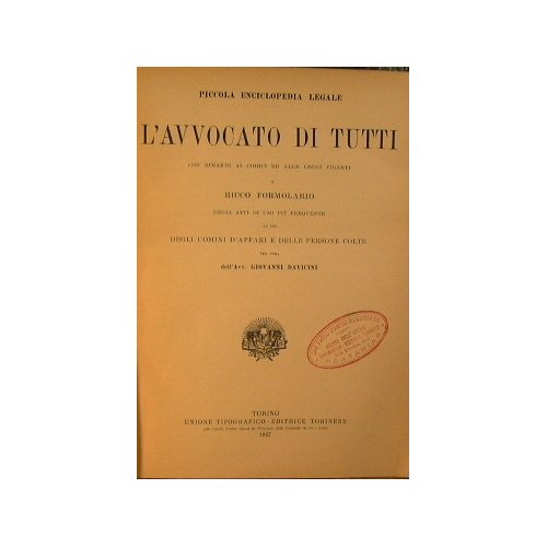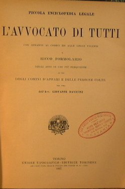 Con rimandi ai codici ed alle leggi vigenti e ricco formolario degli atti di uso più frequente ad uso degli uomini d'affari e delle persone colte. - Collana Piccola enciclopedia legale - in 8° - pp.1250 - Mezza tela - Cerniera rotta