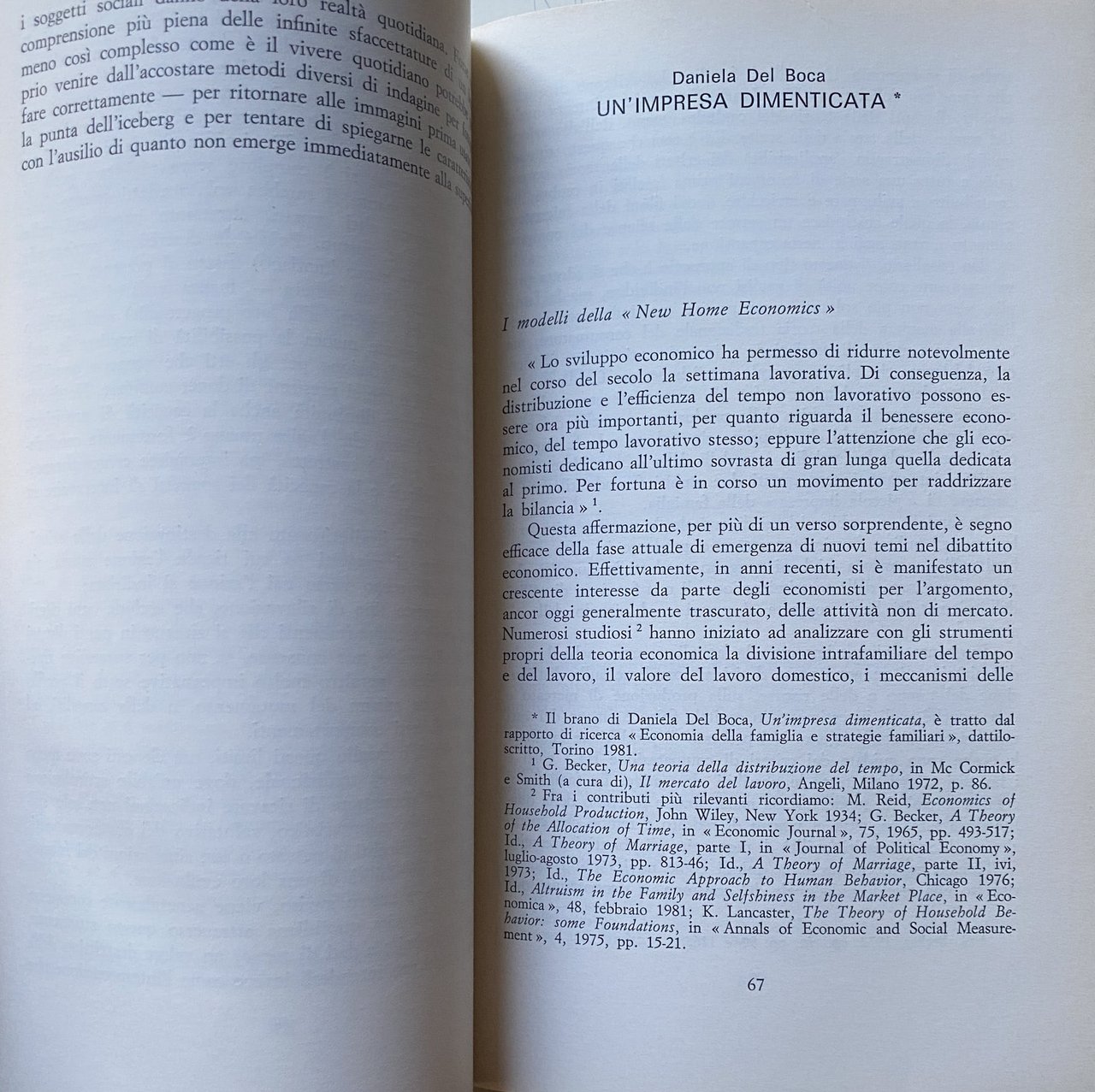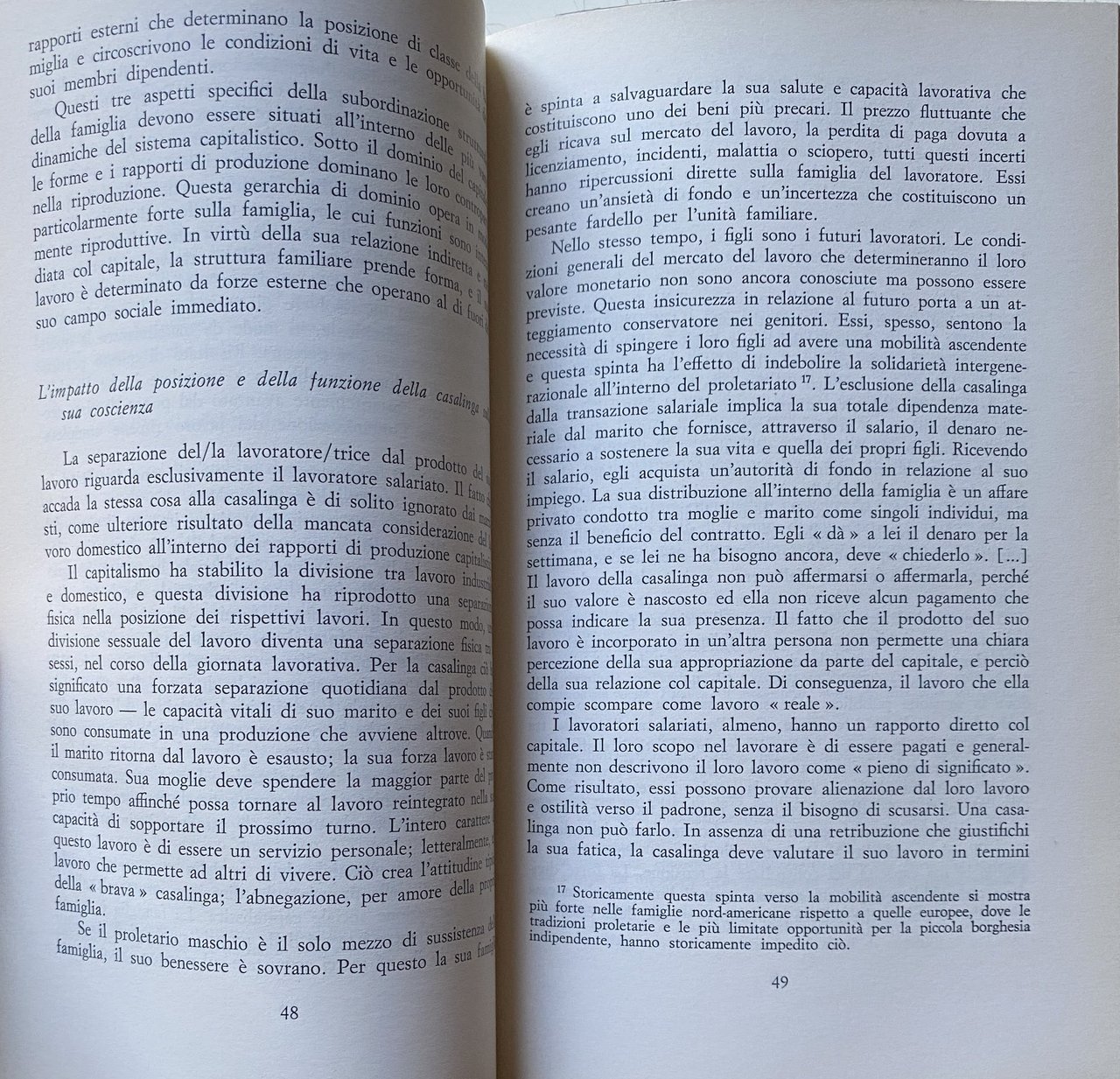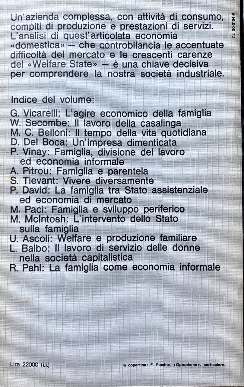 Soggetti: Scienze sociali Storia Sociologia Lavoro domestico Famiglia Relazioni familiari Economia informale Casalinghe Parentela Vicinato Mercato Stipendio Salario Parità di genere Donne Figli Maternità Emancipazione Femminismo Diritti sociali Rapporti di produzione Comunità Studi culturali Stato Assistenza Politica Consumi Occupazione Disoccupazione Sud Nord Divario Gershuny Illegalità Nero Schumacher Hirsch Scitovsky Feige Mendras Ferman Bibliografia Riferimento Saggistica Attualità Dati Libri fuori catalogo Anni Settanta Anni Ottanta Europa Italia Coppie Matrimonio Aiuti Servizi Household Condizioni Casi-studio Divisione Regno Unito Gran Bretagna Germania Francia Lavoratrici Divisione Ruoli Imprese Occidente Capitalismo Industria Impiego Proletariato Lotta di classe Coscienza Vita quotidiana Problemi Attività lavorative Sicurezza Stabilità Risparmio Salute Patriarcato Precariato Marxismo Sachs Bagnasco Città Metropoli Provincia Campagna Artigianato Manifatturiero Cottimo Vacanze Ferie Abitudini Usi e costumi locali Alloggio Affitto Beni immobili Casa proprietà Abitazioni Agnes Pitrou Krause Spesa Imprese familiari Competitività Complessità Comportamenti Condizioni Uomini Giovani Cugno Imprenditorialità Formazione Giuliana Giacinti Capofamiglia Domicilio Agricoltura Anziani Artigiani Moonlighting Maraffi Social sciences History Sociology Household work Family Family relations Informal economy Housewives Kinship Neighborhood Market Salary Wage Gender equality Women Children Motherhood Emancipation Feminism Social rights Production relations Community Cultural studies State Assistance Politics Consumption Employment Unemployment South North Gap Illegality Illegal work Bibliography Reference Non-fiction Current affairs Data Out of print books 1970s 1980s Europe Italy Couples Marriage Aid Services Conditions Case studies Division United Kingdom Great Britain Germany France Female workers Division Roles Businesses West Capitalism Industry Employment Proletariat Class struggle Consciousness Daily life Problems Work activities Security Stability Savings Health Patriarchy Precariat Marxism City Metropolis Province Countryside Craftsmanship Manufacturing Piecework Holidays Holidays Habits Local habits and customs Accommodation Rent Real estate Home ownership Homes Expenditure Family businesses Competitiveness Complexity Behaviors Conditions Men Young Entrepreneurship Training Head of household Domicile Agriculture Elderly Craftsmen