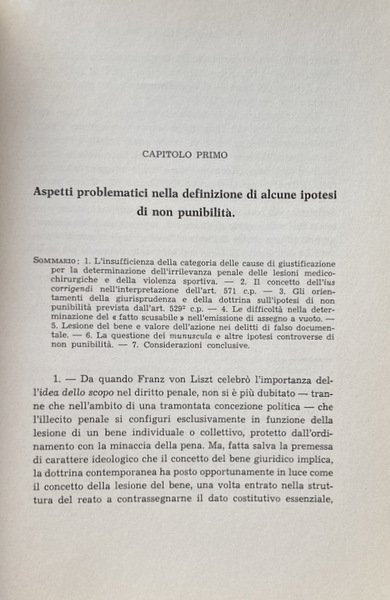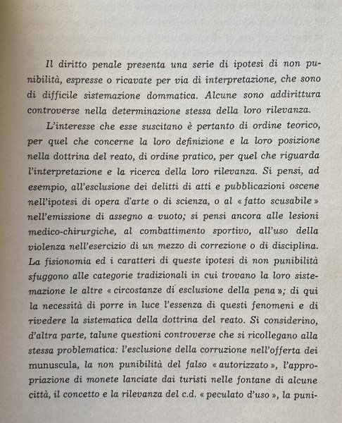 Il diritto penale presenta una serie di ipotesi di non punibilità, espresse o ricavate per via di interpretazione, che sono di difficile sistemazione dommatica. Alcune sono addirittura controverse nella determinazione stessa della loro rilevanza. L'interesse che esse suscitano è pertanto di ordine teorico, per quel che concerne la loro definizione e la loro posizione nella dottrina del reato, di ordine pratico, per quel che riguarda l'interpretazione e la ricerca della loro rilevanza.