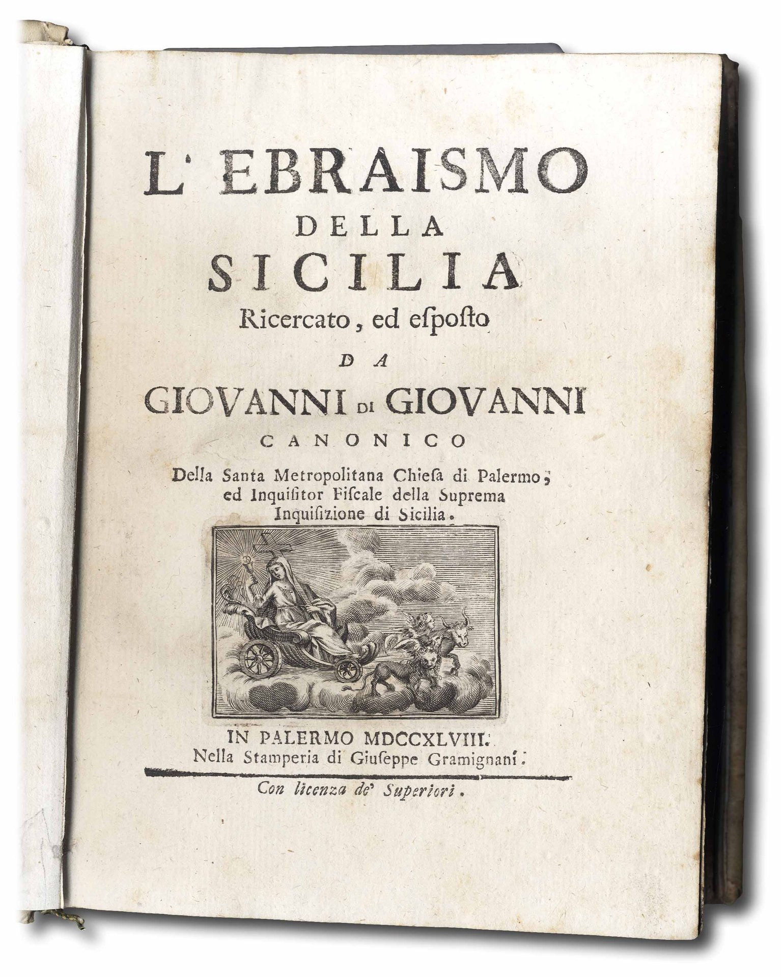 >in-4 (225x165 mm), pp. (2), XX, 420, legatura coeva piena pergamena, titoli e fregi oro al dorso. Con vignetta incisa al titolo, testatina con le armi di Mons. Giacomo Bonanno, vescovo di Patti, a cui l'opera è dedicata, altra testatina a pag. 1, due iniziali incise. Prima edizione di questa vasta e rara opera sulla storia degli Ebrei di Sicilia. ''L'opera è divisa in due parti. Nella prima espone la condizione degli Ebrei nell'isola nostra; e nella seconda tutte le loro comunità. ...Scritta con sana critica grave, e ricca di monumenti'' (Mira). Giov. De Giovanni (1699-1753) fu canonico della metropolitana di Palermo e inquisitore fiscale per la Corte Inquirente della Sicilia. Bell'esemplare marginoso, impresso su carta forte. Narbone I, 183. Mira I, 432. Manca alla biblioteca Moncada Lo Giudice.