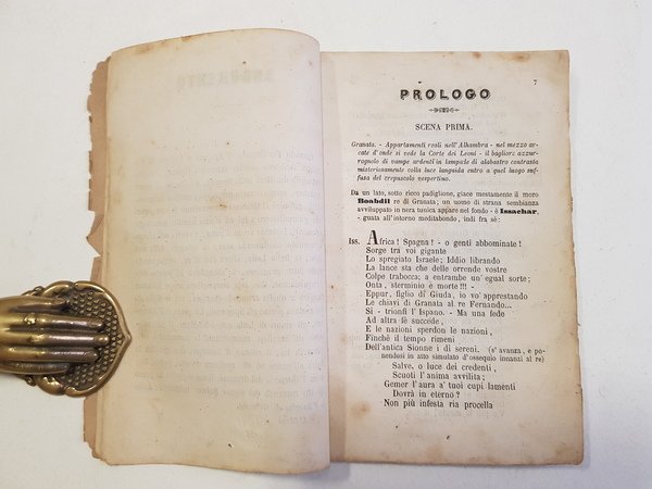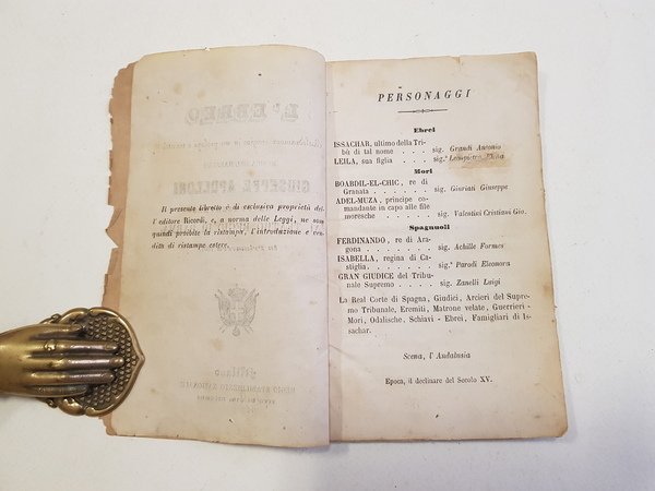 Cm. 17,5 x 11; pp. 35; bross. posticcia muta d'epoca in carta sottile (copertina di reimpiego).<BR>CONDIZIONI DISCRETE: strappetti alla copertina; fioriture e macchioline diffuse.<BR>Con i nomi degli interpreti (Antonio Grandi, Elena Leonpietro, Giuseppe Giuriati, Giovanni Valentini Cristiani, Achille Formes, Eleonora Parodi, Luigi Zanelli).