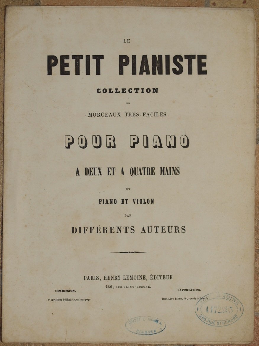 In 4. Dim. 30x22,5 cm. Pp. 7. Edizione senza data ma del 1880 circa della melodia per pianoforte a quattro mani "L'echo des Alpes" di Charles Lentz della collana "Le petit pianiste collection de morceaux tres faciles". In buone condizioni Copertina editoriale in buone condizioni generali con lievi usure ai margini e dorso. Legatura assente. All'interno le pagine si presentano in ottime condizioni con rare fioriture. Edition of 1880's of the melody for piano with four hands "L'echo des Alpes" by Charles Lentz of the series "Le petit pianiste collection de morceaux tres faciles". In good conditions. Editorial cover in good general conditions slightly worn in the edges and spine. Binding is missing. Inside pages are in good conditions with occasional foxings.
