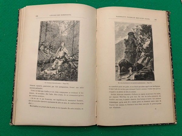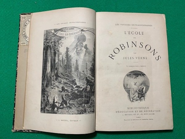 In 4° (25,7x16,5 cm); (4), 202 pp. Legatura coeva in mezza-pelle scura con titolo, autore e filetti in oro al dorso. Vignetta al frontespizio. Opera riccamente illustrata dai disegni di L. Bennet. Prima edizione di questo celebre racconto d'avventura di Jules Verne ispirata alle vicende dello svizzero Robinson di Wyss. Esemplare in buone-ottime condizioni di conservazione.