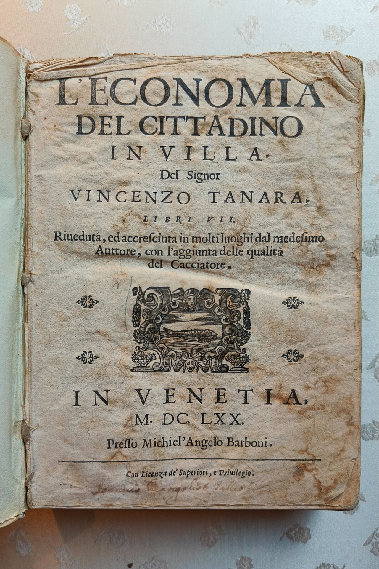 L'economia del cittadino in villa Del Signor Vincenzo Tanara. Libri VII. Riveduta, ed accresciuta in molti luoghi dal medesimo Auttore, con l'aggiunta delle qualità del Cacciatore. In Venetia, M.DC.LXX. Presso Michel'Angelo Barboni. Con Licenza de' Superiori, e Privilegio. Prima edizione del 1644.
