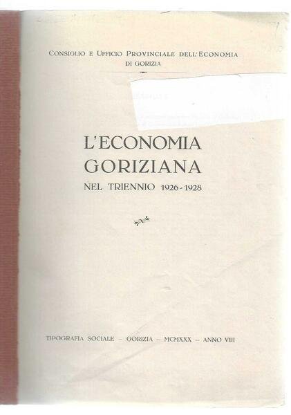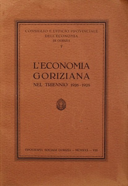 Gorizia,1930.In 8¡,146 pp., + una tavola ripiegata fuori testo. Brossura editoriale con titoli, in cornice, il frontespizio di questo raro volume presenta un ritaglio a rettangolo, che nulla toglie alla completezza del frontespizio. Piatti leggermente scoloriti dal sole, testa del dorso strappata. Edito a cura del Consiglio e Ufficio prov. dell'Economia di Gorizia.