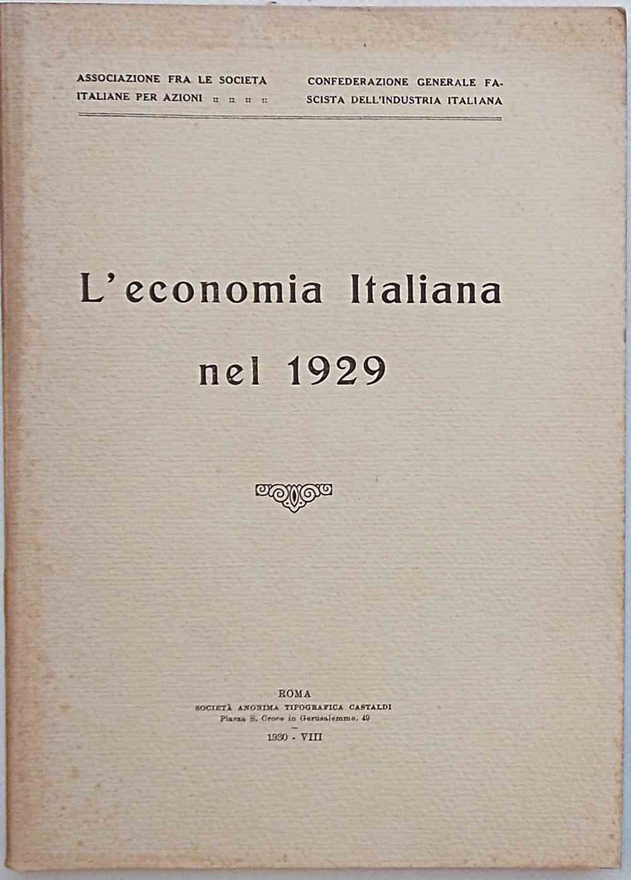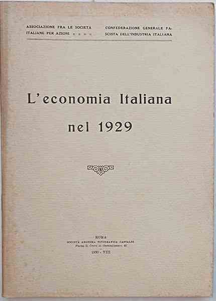 In 8° (cm. 25 x 18); pagg. 263; con XXVII tabelle n.t.; leggera cartonatura originale. VG-. ** A cura della Associazione fra le Società Italiane per Azioni e la Confindustria. "Il 1929 passerà alla storia." (!)