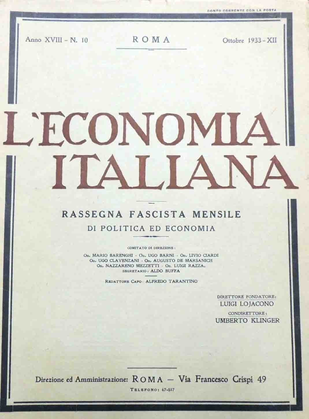 L’economia italiana. Rassegna fascista mensile di politica ed economia, a. XVIII, n. 10, ottobre 1933