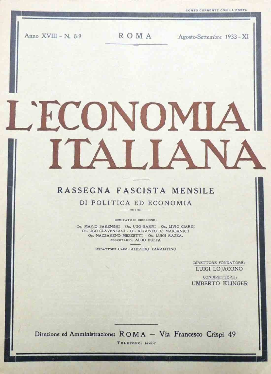 L’economia italiana. Rassegna fascista mensile di politica ed economia, a. XVIII, n. 8-9, agosto-settembre 1933