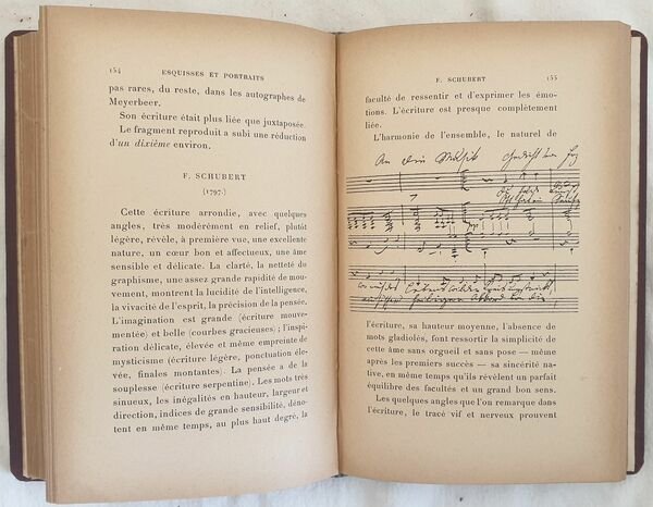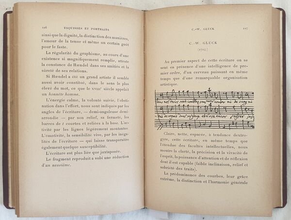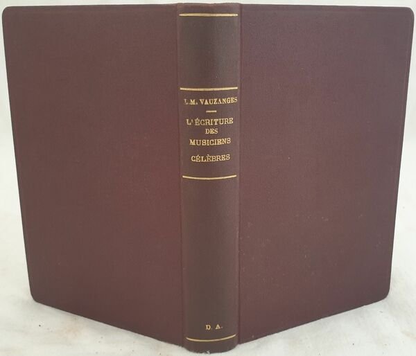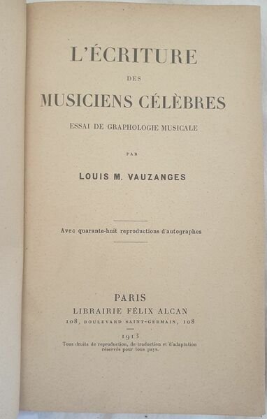 Edizione del 1913 di questo curioso studio grafologico sulla scrittura dei compositori famosi di Louis M. Vauzanges. All'interno: Studio analitico delle scritture, L'immaginazione musicale(psicologia e grafologica), Schizzi e ritratti (Lully , Rameau , Bach , Hendel , Gluck , Haydn , Gretry , Mozart , Mehul , Beeethoven , Boieldieu , Spontini , Auber , De Weber , Herold , Rossini , Meyerbeer , Schubert , Donizetti , Berlioz , Chopin , Mendelssohn , David , Schumann , Liszt , Thomas , Verdi , Wagner , Gounod , France , Masse , Reyer , Delibes , Bizet ecc. Alcune illustrazioni. In ottime condizioni. Copertina in tela con titolo e decorazioni in oro al dorso in ottime condizioni generali con lievi usure ai margini e dorso. Legatura in buone condizioni. All'interno le pagine si presentano in buone condizioni con fioriture. In 8. Dim. 20x13,5 cm. Pp. XV+240+36 Peso Kg. 0,650.Edition of 1913 of this nice study about the writing of famous composer by Louis M. Vauzanges. Inside: Analytic study of writings, Musical imagination (psichology and graphology), Portraits (Lully , Rameau , Bach , Hendel , Gluck , Haydn , Gretry , Mozart , Mehul , Beeethoven , Boieldieu , Spontini , Auber , De Weber , Herold , Rossini , Meyerbeer , Schubert , Donizetti , Berlioz , Chopin , Mendelssohn , David , Schumann , Liszt , Thomas , Verdi , Wagner , Gounod , France , Masse , Reyer , Delibes , Bizet ecc. Some illustrations. In very good conditions. Cloth cover with gilted title and decorations in the spine in very good general conditions lightly worn in the extremities. Binding in good conditions. Inside pages are in good conditions with foxing. In 8. Dim. 20x13,5 cm. Pp. XV+240+36 Peso Kg. 0,550.