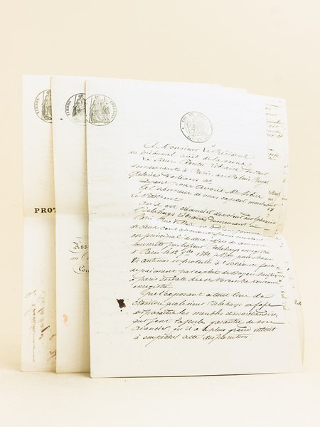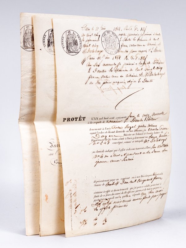 [ L'éditeur Edouard Dentu poursuit son confrère libraire et éditeur Adolphe Delahays. Recueil de 4 actes d'huissier agissant en recouvrement d'une somme de 250 francs due par Adolphe Delahays ] Protêt daté du 11 novembre 1862 : "A la demande de M. Edouard Dentu, éditeur demeurant à Paris Palais Royal Galerie d'Orléans, [. ] j'ai Charles Pierre Dayan Tribunal de Première Instance [ . ] somme et interpellé Mr. Delahays au domicile [.] rue Voltaire n°4 ou étant et parlant à la dame son épouse ainsi déclaré de présentement payer au requérant ou à moi Huissier, pour lui porteur, la somme de 250 fr. [. ] laquelle a répondu que son mari ne lui avait remis aucun fonds pour payer les essais présentés" - Assignation au Tribunal de commerce daté du 13