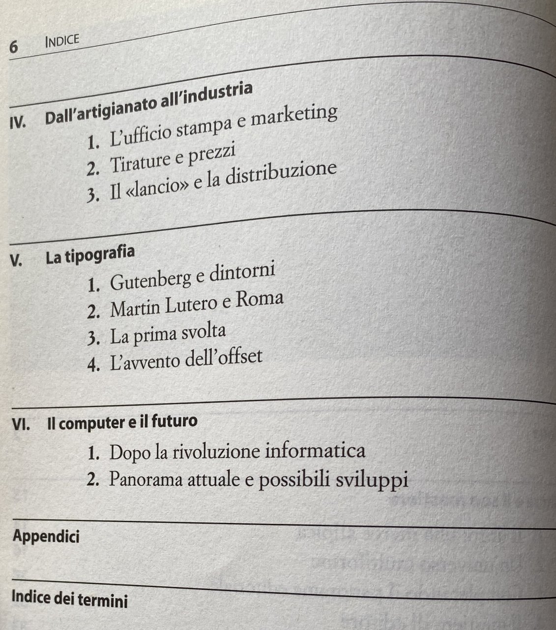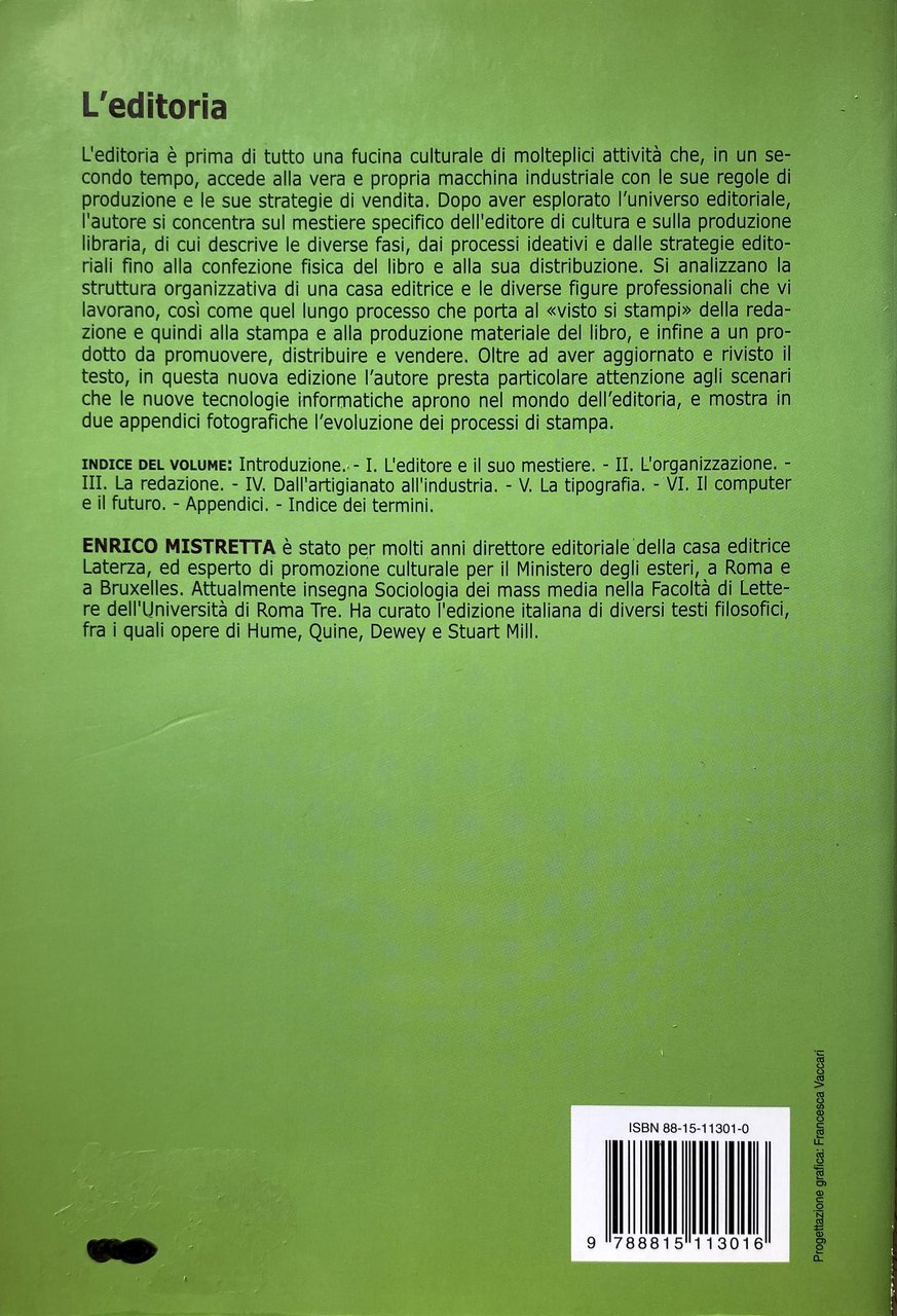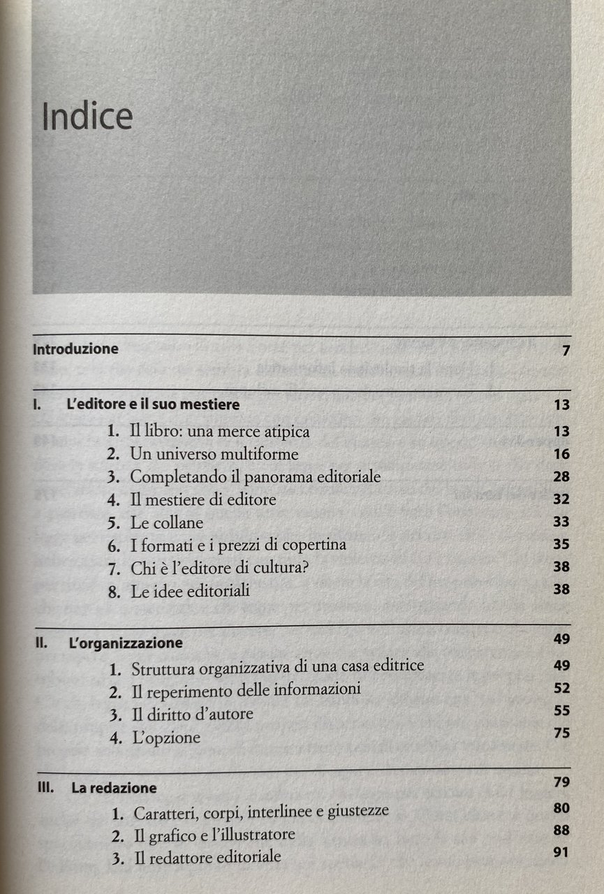 INDICE DEL VOLUME: Introduzione I L'editore e il suo mestiere II L'organizzazione III La redazione. IV. Dall'artigianato all'industria V La tipografia VI Il computer e il futuro Appendici. Indice dei termini.