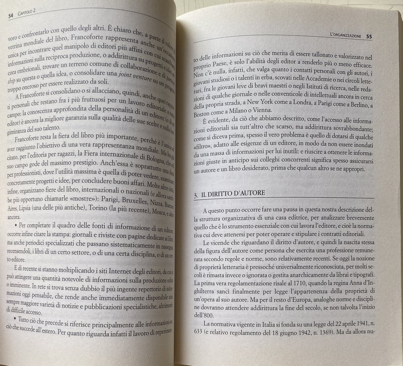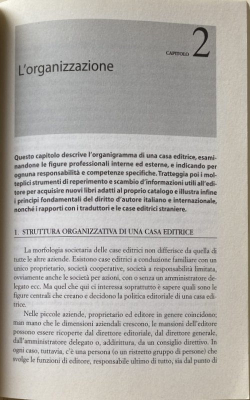 After having browsed the diverse universe of publishers, the author focuses on specific skill of the editor in culture and on book production, of which describes the different stages, creative processes and editorial strategies until the physical box of the book and its distribution. Discusses the organizational structure of a publishing house and the different professionals who work there, as well as the long process leading first to "ready to print" writing, then printing and physical production of the book, and finally to a product to promote, distribute and sell. A particular look is given to scenarios that information technologies open up in the publishing world.