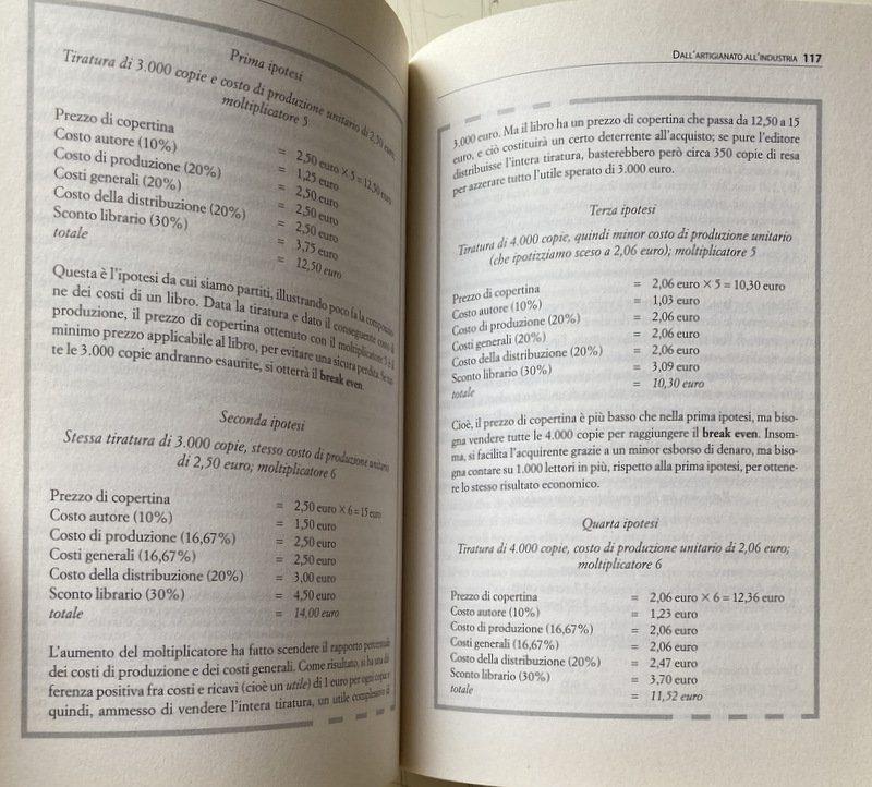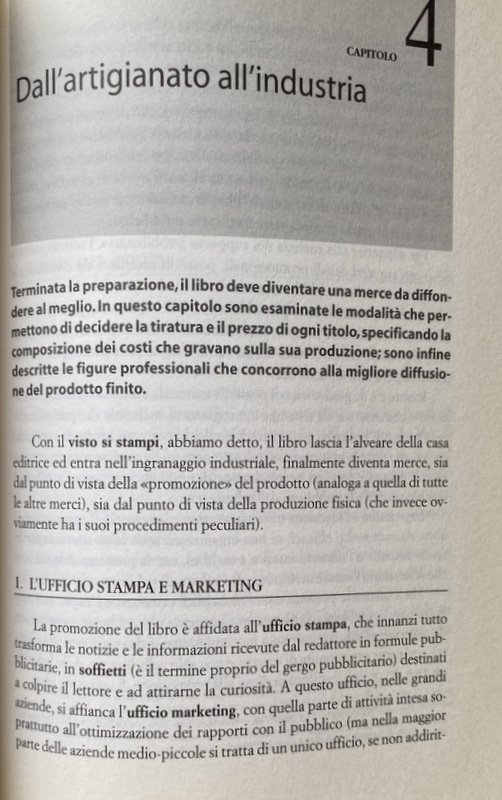 Soggetti: Stampa, Editoria, Editori, Manuali, Guide, Università, Professioni, Politica, Comunicazione, Mass Media, Cultura, Pubblicazione, Vendita, Case editrici, Produzione libraria, Fasi, Strategie editoriali, Distribuzione, Struttura organizzativa, Casa editrice, Figure professionali, Redazione, Promozione, Presentazione, Autori, Promuovere, Distribuire, Vendere, Bestseller, Casi editoriali, Successi, Caratteri, Bozze, Correzione, Correttori, Linea editoriale, Collane tematiche, Argomenti, Commercio, Percentuali, Guadagno, profitto, Costi, Remainders, Sconti, Librai, Bibliofilia, Investimenti, Finanziamenti, Politica culturale, Tecnologie informatiche, Tecnica, Tecnologia, Giornalismo, Economia, Diritto d'autore, Lavoro, Studi di Settore, Industria, Management, Ritocchi, Miglioramenti, Limature, Curatela, Lettori, Pubblico, Contratti editoriali, Lezioni, Libraria, e-reading, Ebook, Digitale, Libri rari fuori catalogo, Storia, Cifre, Dati, Statistiche, Mercato, Estero, Traduzione, Traduttori, Mediazione, Self publishing, Piattaforme social, Influencer, Aspetti giuridici, fiscali, contabili, IVA, Imposte, Copyright, Compensi, Passivo, Periodici, Giornali, Resi, Scrittori famosi, Letteratura, Romanzi, Narrativa, Saggistica, Domanda, Offerta, Librerie, Biblioteche, Diffusione, Fatturato, Grandi Gruppi editoriali, Roberto Bazlen, Roberto Calasso, Olivetti, Lutero, Associazione, Lettura, Critica letteraria, Critici, Recensioni, Analisi, Grafica, Termini tecnici, Glossario, Bibliografia, riferimento, Consultazione, Collezionismo, Autografi, Copertina, Prefazioni, Introduzioni, Frontespizio, Retro, Capoverso, Punteggiatura, Errata corrige, Errori, Refusi, Antologie, Raccolte, Poesia, Per bambini, Illustrati, Carta, Riciclo, Macero, Dorso, Club, Dedica, EAN, Codici, Elzeviro, Ristampe, Fiere, Usato, Scuola, Scolastici, Incunaboli, Indici, Lancio, Layout, Maiuscoletto, Corsivo, Licenza, Proprietà, Prezzo, Pagine, Pixel, Grassetto, Citazioni, Agenzie, Anastatica, Apici, Brossura, Rilegatura, Colophon, Consulenza, Commissione, Cedola, Cliché, Classici, CTP, Diritto morale, Possesso, Direttore, Patrimoniale, Secondario, Distributore, Dedica, Deposito legale, Rimanenze, Magazzino, Giustezza, Interlinea, Occasioni, Ottavo, Formato, Tascabili, Economici, Pregiati, Carta patinata, Tiratura limitata, Illustratori, Lancio, Resa, Riga, Spazio, Inchiostro, Royalty, Scanner, Sedicesimo, Velina, Sovraccoperta, SIAE, Video, Voce, Umberto Eco, Cessioni, Legge, Leggi, Bilancio, Approvvigionamento, Logistica, Marketing, Consumatori, Diritti, Capitale, Longanesi, Guanda, Tea, McGraw-Hill, Giulio Einaudi, Bompiani, Astrolabio, Guida, Liguori, Adelphi, Arnoldo Mondadori, Feltrinelli, Rizzoli, RCS, Garzanti, Ricavi, Utet, Buffetti, Messaggerie, Fabbri, Giunti, Istituto dell'Enciclopedia italiana, Treccani, Crusca, Aziende, ISTAT, Etas, Electa, Titoli, Classifiche, Roland, Offset, Pellicola fotolito, Laser, Impaginatore, Impaginazione, Italo Calvino, A. Ormezzano, AIE, Gross proceeds, Clausole, Break even, Ottmar Mergenthaler, Cianografica, Colori, Run on, Copie, Castello, Linguaggio tecnico, Budget, Monotype, Lastre, Matrici, Piombo, Cromalin, Epson, Internet, Mussano, Nicola Tranfaglia, G. Turi, G. Vigini, Giacomo Marramao, Raffaele Simone, Michele Abrusci, Tipometri, Riga pica, Forfait, Corrispondenza, Cartelle dattiloscritta, Opera di ingegno, Didascalia, Quarta, Retro, Normari, Lettere Press Publishing Publishers Manuals Guides University, Professions Politics Communication Culture Publication Sales Publishing houses Book production, Phases Editorial strategies Distribution Organizational structure Publishing house Professional figures team Promotion Presentation Authors Promote Distribute Sell cases Successes Characters Drafts Correction Correctors Editorial line Thematic series Topics Commerce Percentages Earnings profit Costs Remainders Discounts Booksellers Bibliophilia Investments Financing Cultural policy Information technologies Technique Technology Journalism Economy Copyright Work Sector studies Industry Touch-ups Improvements Filings Curation Readers Public Publishing contracts Lessons Bookshop Digita, Out of print rare books History Figure Data Statistics, Market Foreign Translation Translators Mediation Legal fiscal accounting aspects Taxes Fees Liabilities Periodicals Newspapers Returns Famous writer Literature Novels Non-fiction Demand Offer Bookshops Libraries Circulation Turnover Large publishing groups Association Reading Literary criticism Critics Reviews Analysis Graphics Technical terms Glossary Bibliography reference Consultation Collecting Autographs Cover Prefaces Introductions Frontispiece Back, Paragraph Punctuation Errors Misprints Anthologies Collections Poetry For children Illustrated Paper Recycling Waste Spine Dedication Codes Reprints Fairs Used School Scholastic Incunabula Indexes Launch Small caps Italic License Ownership Price Bold Citations Agencies Anastatic Superscripts Paperback Binding Consulting Commission Coupon Classics Moral right Possession Director Property Secondary Distributor Dedication Legal deposit Inventories Warehouse Rightness Line spacing Occasions, Eighth Format Paperbacks Economical Fine Coated paper Limited run Illustrators Launch Yield Row Space Ink Sixteenth Vellum Dust jacket Transfers Laws Budget Procurement Logistics Consumers Rights Rankings Photolithic film Clauses Blueprint Colors Copies Castle Technical language Plates Matrices Lead Typometers Correspondence Typed folders Intellectual work Caption Quarter Back Letters
