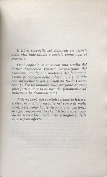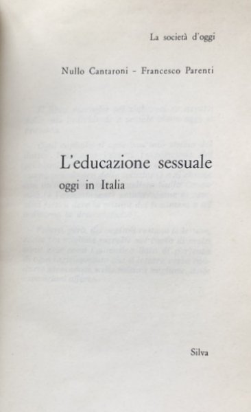 Soggetti: Educazione sessuale, Società italiana, Anni Sessanta, Anni Cinquanta, Sessualità, Erotismo, Amore, Giovani, Borghesia, Mentalità, Costumi sessuali, Abitudini, Desiderio, Maschilismo, Donne, Femminismo, Psicologia, Inchieste, Reportage, Indagini, Saggi, Lettere, Relazioni sentimentali, Classi sociali, Dopoguerra, Emancipazione femminile, Famiglia, Aborto, Tradizioni, Scienze sociali, Valori, Nevrosi, Sesso, Matrimonio, Magia, Superstizione, Omosessualità, Giornalismo, Libri rari, Libri Vintage, Fuori catalogo, Case studies, Sex instruction, Sex education, Italian society, Sixties, Fifties, Sexuality, Eroticism, Love, Young people, Middle class, Mentality, Sexual costumes, Habits, Desire, Male chauvinism, Women, Feminism, Psychology, Investigations, Investigations, Essays, Letters, Sentimental relationships, Social classes, Post-war, Female emancipation, Family, Abortion, Traditions, Social sciences, Values, Neurosis, Marriage, Magic, Superstition, Homosexuality, Journalism, Books out of print