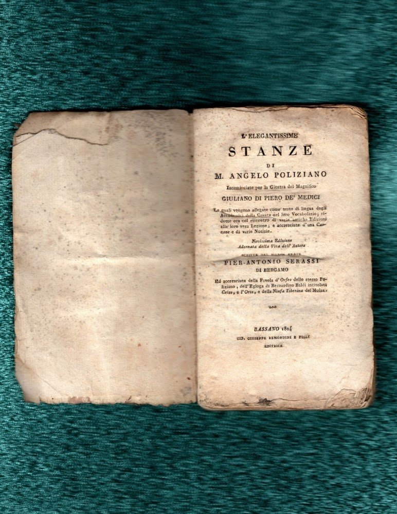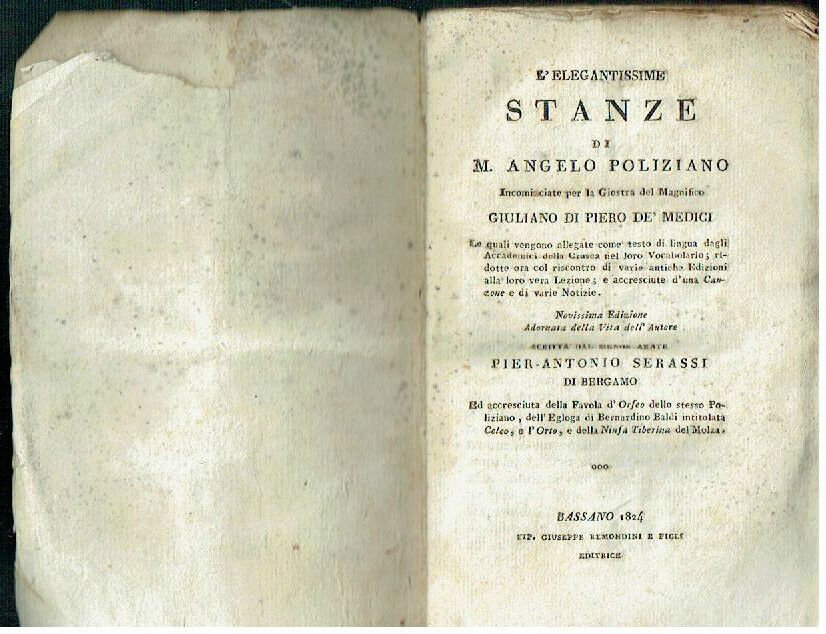 Titolo: L`elegantissime Stanze di Messer Angelo Poliziano incominciate per la Giostra del Magnifico Giuliano di Piero de` Medici.