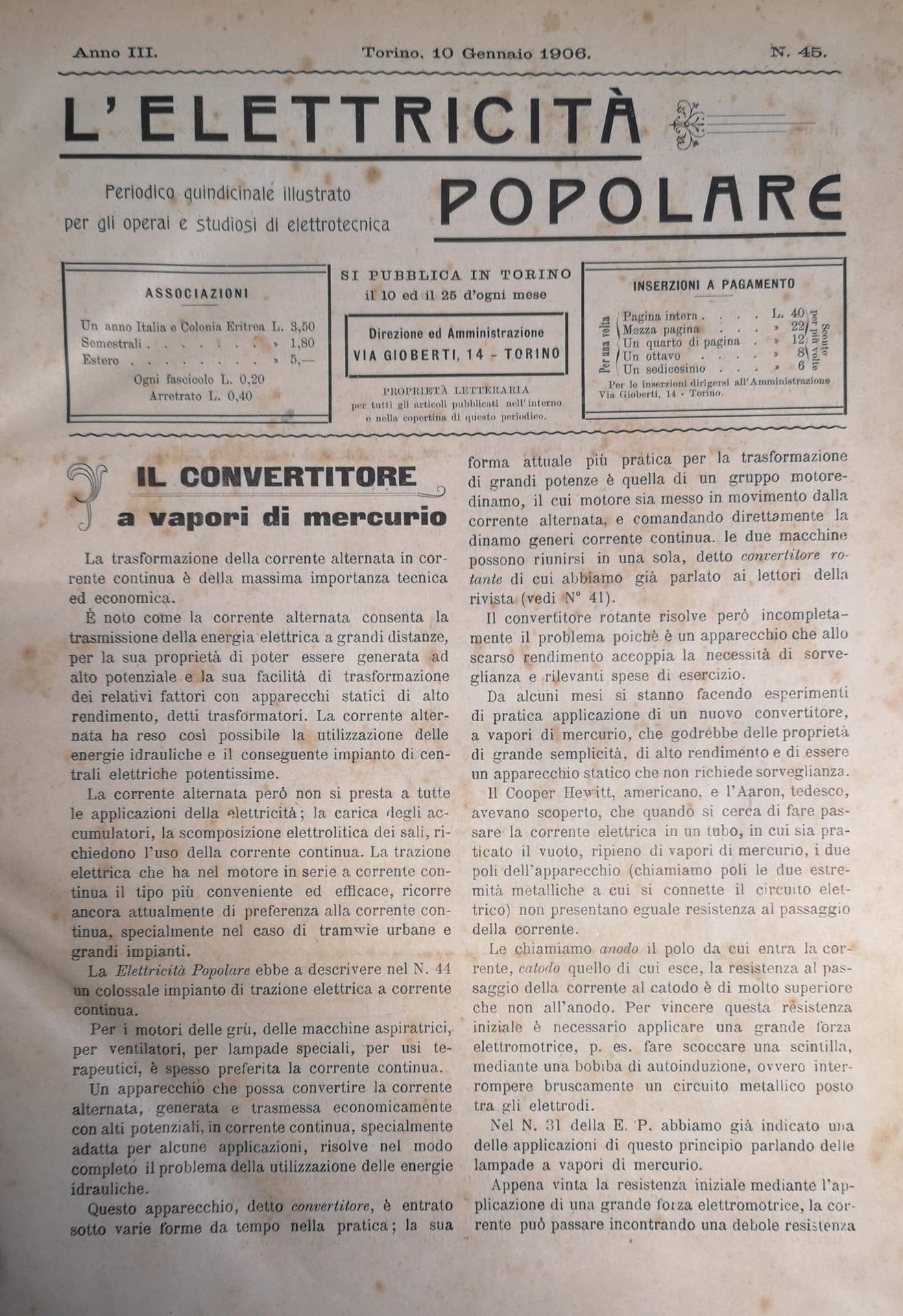 L'ELETTRICITÀ POPOLARE. Annate 1906 1907 1908. - Periodico quindicinale illustrato.