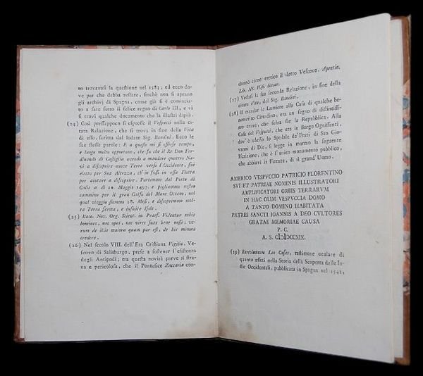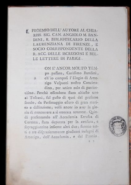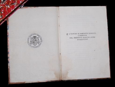 In 8° grande; (26) c. di carta non numerate. Bella legatura coeva in mezza pelle con titolo in oro al dorso in parte scolorito. Piatti foderati da carta marmorizzata coeva. Antico ex-libris nobiliare applicato alla prima carta bianca di Giuseppe Mannucci Benincasa. Un leggerissimo alone al margine basso interno delle prime ed ultime 4 carte. Ininfluente. Piccolo timbro nobiliare alla seconda carta. Esemplare nel complesso in buone-ottime condizioni di conservazione. Lopera contiene un secondo titolo impresso in rosso a carta a5 Comincia lelogio di Amerigo Vespucci composto dal proposto Marco Lastri dottore in Teologia. Prima edizione, stampata in sole cento copie di questo celeberrimo elogio di Amerigo Vespucci scritto dal famoso letterato ed ecclesiastico fiorentino, Marco Lastri. Al colophon la dicitura Finito lElogio di Amerigo Vespucci composto dal Proposto M. Lastri: Impresso in Firenze in numero di C. copie per Francesco Moucke fiorentino nel MDCCLXXXVII. A dì XXIV. Settembre. Laus Deo.. Lautore scrisse lopera su tema proposto dallAccademia della Crusca che aveva deciso in questo modo di dar lustro alla figura del grande navigatore, esploratore e cartografo fiorentino, fra i primi ad esplorare il nuovo mondo, Amerigo Vespucci. Molto raro, solo 100 esemplari stampati. Rif. Bibl.: IT\ICCU\TO0E\014967.