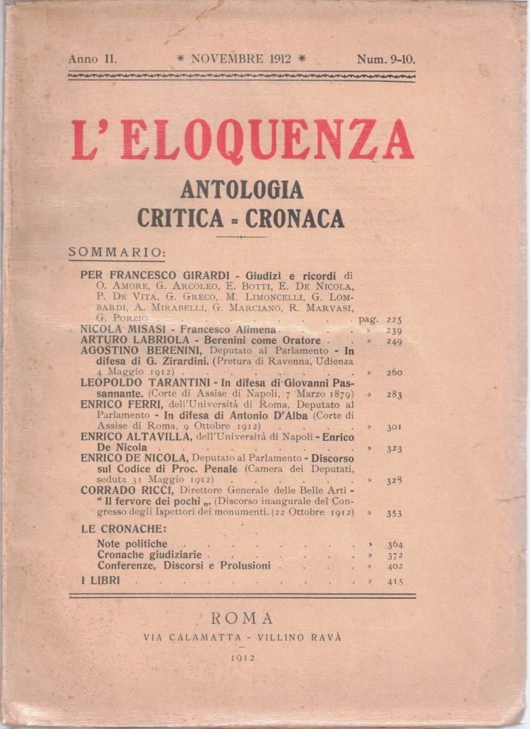 L’eloquenza. Antologia critica cronaca, direttore Antonio Russo, Roma (ma stampato a Città di Castello con i tipi della Società Tipografica Leonardo da Vinci), anno II, numeri 9-10, novembre 1912, pp. 226-422, 7 c. di tavv. f.t. ill. b.n., cm 25, br. ed. Sommario: O. Amore et al., Per Francesco Girardi. Giudizi e ricordi – Nicola Misasi, Francesco Alimena – Arturo Labriola, Berenini come oratore – Agostino Berenini (Deputato al Parlamento), In difesa di G. Zirardini (Pretura di Ravenna, udienza 4 maggio 1912) – Leopoldo Tarantini, In difesa di Giovanni Passanante (Corte d’Assise di Napoli, 7 marzo 1879) – Enrico Ferri (Università di Roma, Deputato al Parlamento), In difesa di Antonio D’Alba (Corte di Assise di Roma, 9 ottobre 1912) – Enrico Altavilla (Università di Napoli), Enrico De Nicola – Enrico De Nicola (Deputato al Parlamento), Discorso sul Codice di Proc. Penale (Camera dei Deputati, seduta 31 maggio 1912) – Corrado Ricci (Direttore Generale delle Belle Arti), Il fervore di pochi (Discorso inaugurale del Congresso degli Ispettori dei monumenti, 22 ottobre 1912) – Le cronache (Note politiche – Cronache giudiziarie – Conferenze, discorsi e prolusioni) – I libri. All’interno del fascicolo 7 tavole ill. b.n. con ritratti di: Francesco Girardi, Francesco Alimena, Agostino Berenini, Leopoldo Tarantini, Enrico Ferri, Enrico De Nicola, Corrado Ricci. Minime fioriture alla brossura, tenue brunitura della carta, per il resto esemplare ben conservato. In buona parte intonso.
