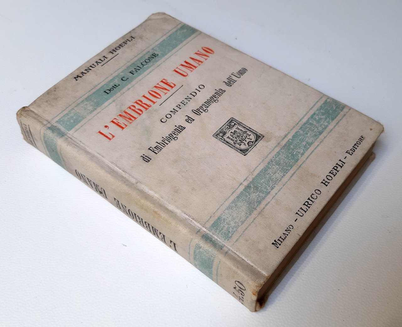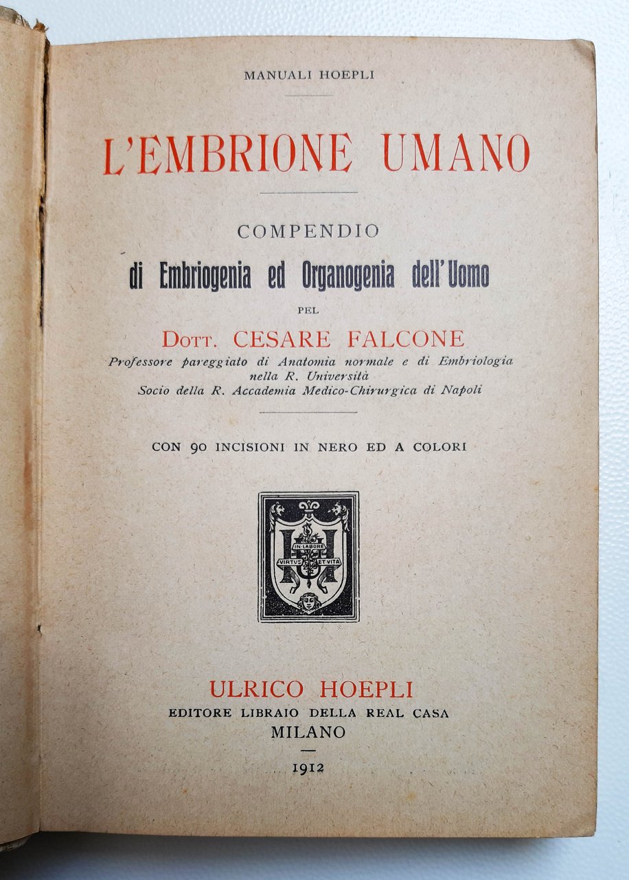 L'embrione umano. Compendio di Embriogenia ed Organogenia dell'Uomo pel Dott. Cesare Falcone, Professore pareggiato di Anatomia normale e di Embriologia nella R. Università Socio della R. Accademia Medico-Chirurgica di Napoli. Con 90 incisioni in nero ed a colori