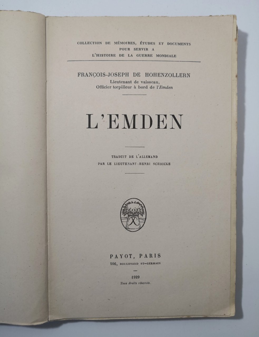 L'EMDEN di Francois Joseph De Hohenzollern 1929 Payot LIbro I W W Guerra Nave
