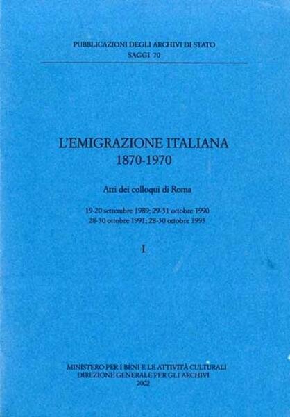 2 v. (1399 p. complessive) ; 24 x 17 cm. Pubblicazioni degli archivi di Stato, Saggi, 70. L'opera raccoglie i contributi dei quattro incontri tenuti a Roma presso la Biblioteca nazionale centrale Vittorio Emanuele II e presso l'Archivio di Stato tra il 1989 e il 1993. Un'opera che è un utile strumento d'indagine e studio, con un'ampia rassegna bibliografica e di fonti, su un fenomeno complesso come quello dell'emigrazione che ha coinvolto milioni di italiani a cavallo del 19. e 20. secolo. Brossura editoriale, coperta in cartoncino flessibile colorato con impresso il titolo al piatto e al dorso. Codice libreria 7922.
