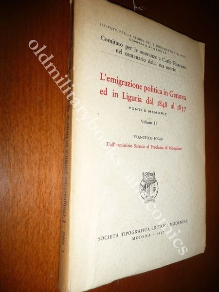 TITOLO: L'EMIGRAZIONE POLITICA IN GENOVA ED IN LIGURIA DAL 1848 AL 1857 DALL' ARMISTIZIO DI SALASCO AL PROCLAMA DI MONCALIERI. DESCRIZIONE: COMITATO PER LE ONORANZE A CARLO PISACANE NEL CENTENARIO DELLA SUA MORTE. Società Tipografica Modenese Modena 1957 I^ Ed., br. ed. con alette, pp. da 191 a 458 ed. numerata ns. esemplare 254 in 8°. CONDIZIONI: Ottime. PESO / WEIGHT: 485 gr. without package